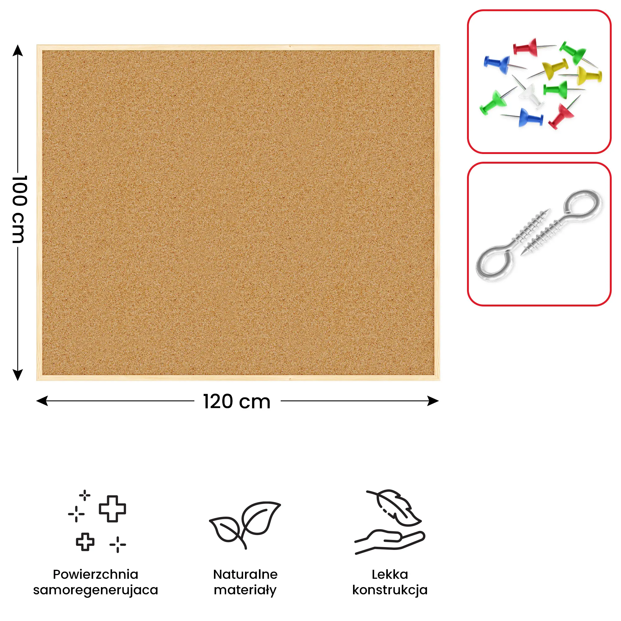 Tablica korkowa w rozmiarze 120x100 cm ma właściwości samoregenerujące. Oznacza to, że po krótkim czasie po wyciągnięciu igły lub pinezki, korek samoczynnie się kurczy. Zapewnia to długoletnią wytrzymałość i możliwość intensywnego używania tablicy.