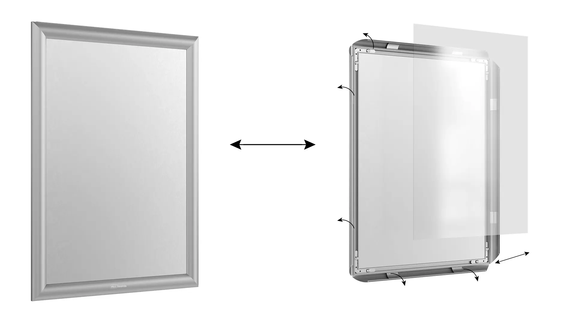 - Intuicyjna wymiana treści – ramka otwierana typu OWZ umożliwia błyskawiczną aktualizację materiałów. Wystarczy ją otworzyć, wsunąć nową grafikę i zamknąć zatrzask. Rozwiązanie to sprawdza się szczególnie w miejscach, gdzie treść zmienia się często, np. w lokalach gastronomicznych, punktach usługowych czy recepcjach.