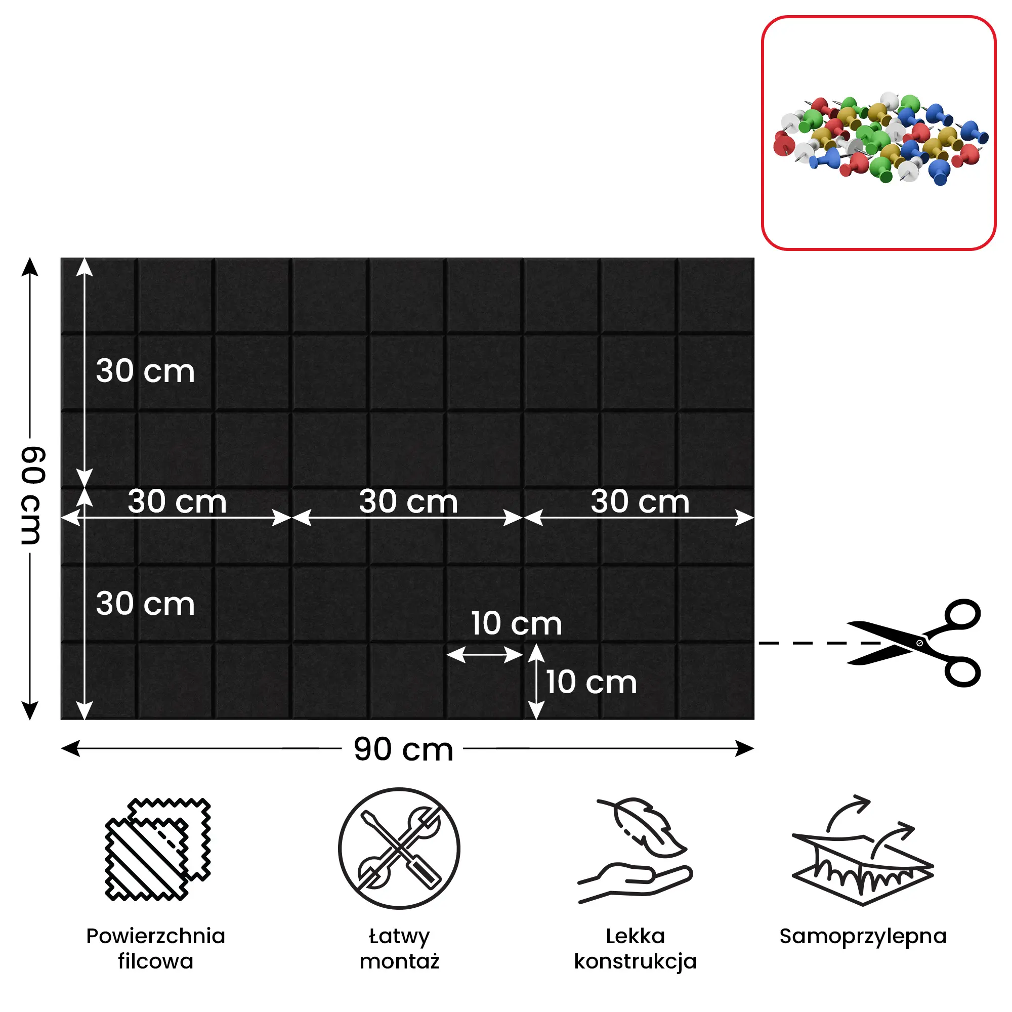 • PRAKTYCZNA PRZESTRZEŃ – filcowa powierzchnia umożliwia wygodne przypinanie notatek, zdjęć, planów czy inspiracji przy pomocy pinezek. Idealna do codziennego użytku w domu, biurze, szkole czy pokoju dziecka.