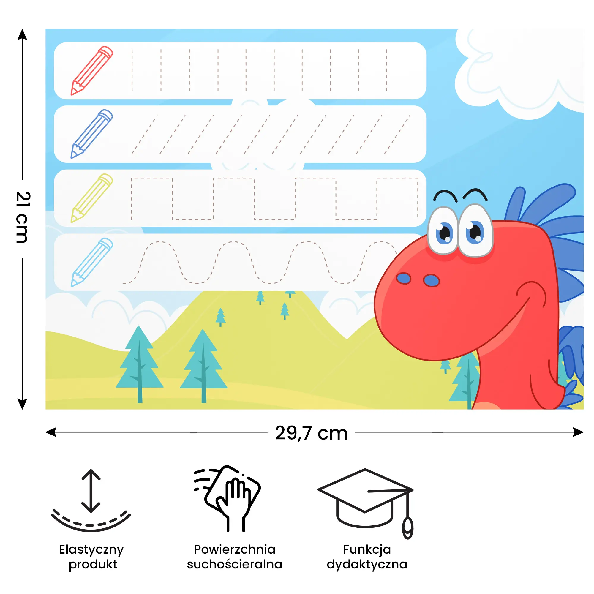 • WYJĄTKOWY NADRUK wzór przedstawia Smoka Edzia na tle gór, drzew i błękitnego nieba, co tworzy spokojną, przyjazną scenerię sprzyjającą pierwszym szkolnym ćwiczeniom. Górna część nakładki została zaprojektowana z myślą o ćwiczeniu szlaczków, które wspierają rozwój motoryki małej i pomagają przygotować rękę do pisania. To idealna propozycja dla dzieci rozpoczynających naukę.