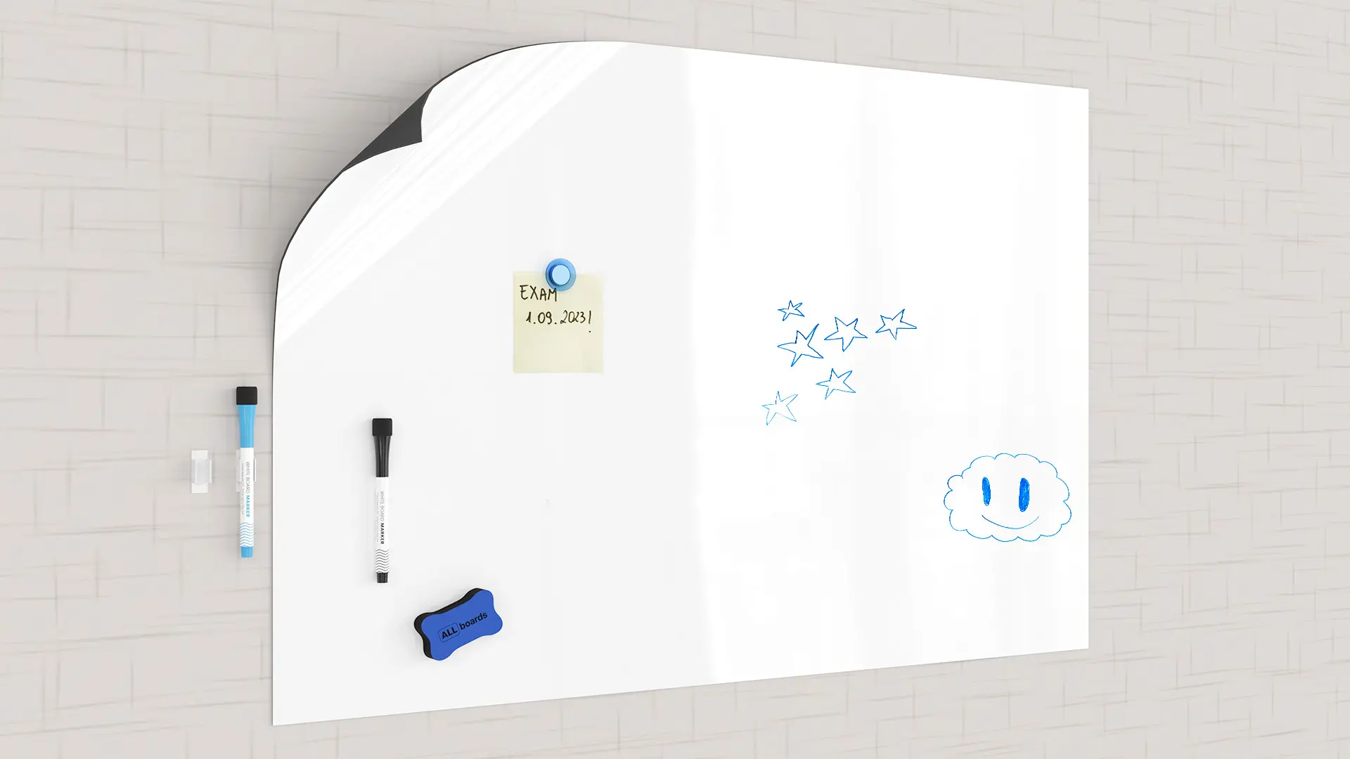 Nakładka samoprzylepna suchościeralna ALLboards może być traktowana jako supercienka tablica, pokryta z tyłu warstwą kleju, dzięki czemu z łatwością przyczepisz ją do wybranej ściany czy innej gładkiej powierzchni – szybko, łatwo i bez wiercenia! Nakładka nie przyczepia się do tablicy magnetycznej.