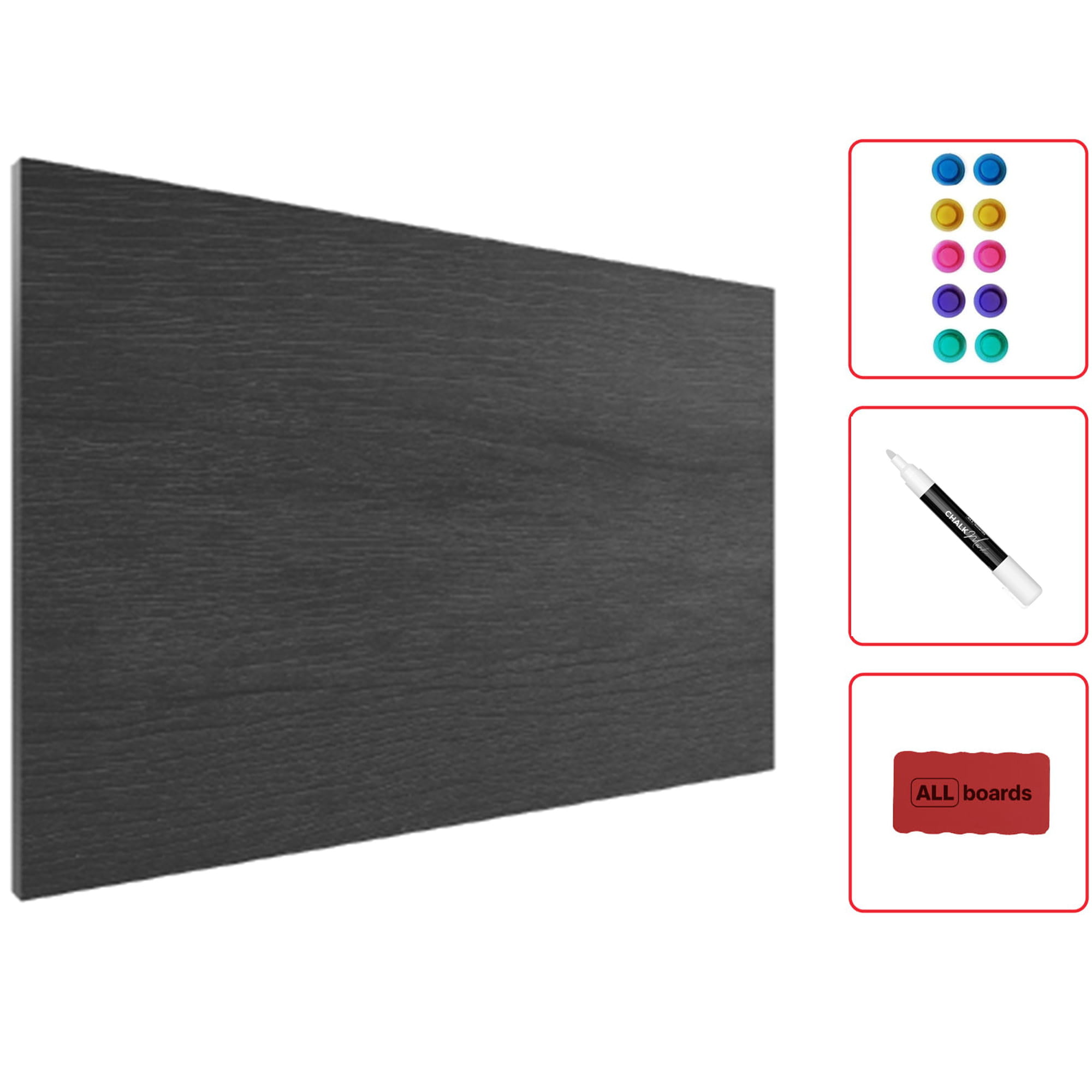 W zestawie wraz z tablicą znajdziesz: gąbkę do łatwego zmywania pisaków, biały marker oraz 10 kolorowych magnesów.