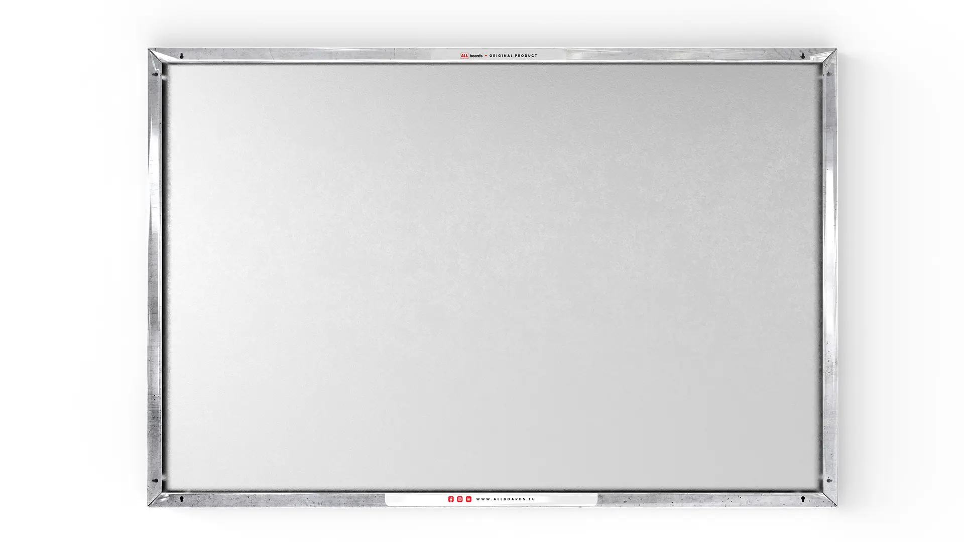 Magnetyczna tablica METALboards wyposażona jest w osiem otworów montażowych. Po dwa otwory znajdują się w każdym z rogów tablicy. Dzięki temu tablica z łatwością może zostać powieszona w pionie lub poziomie.