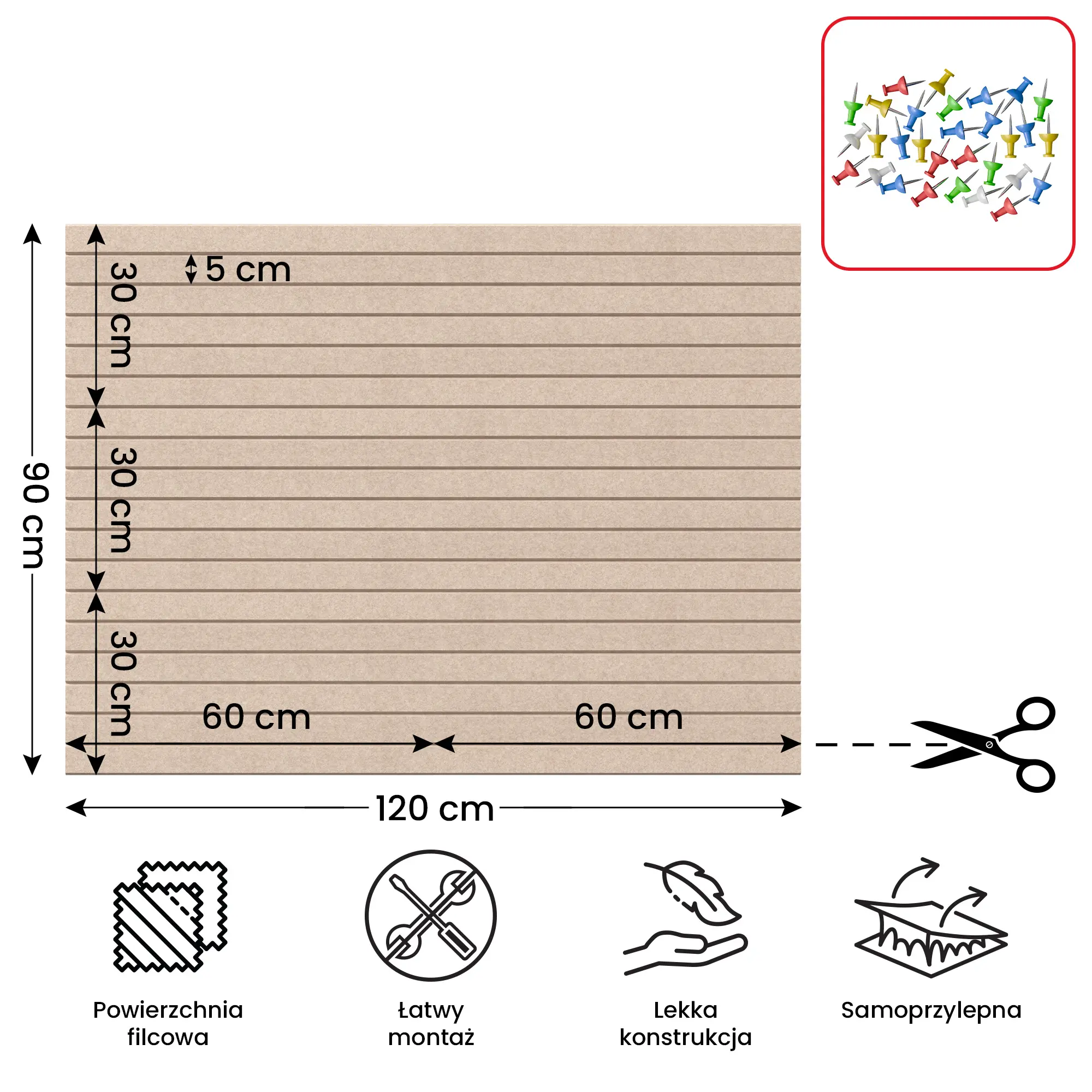 - PRAKTYCZNA PRZESTRZEŃ – filcowa powierzchnia umożliwia wygodne przypinanie notatek, zdjęć, planów czy inspiracji przy pomocy pinezek. Idealna do codziennego użytku w domu, biurze, szkole czy pokoju dziecka.
