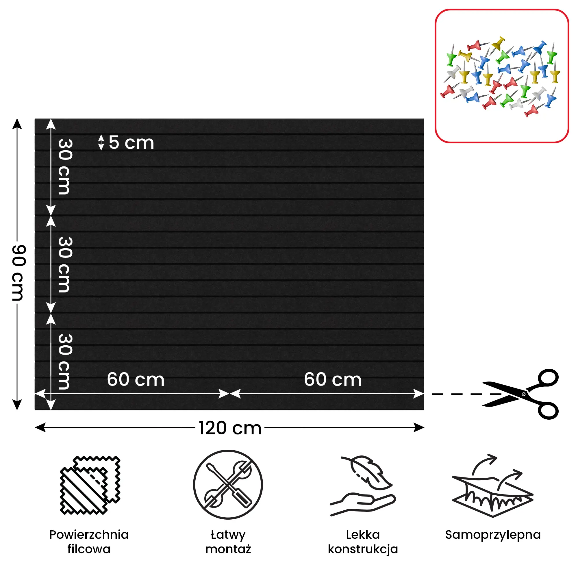 - PRAKTYCZNA PRZESTRZEŃ – filcowa powierzchnia umożliwia wygodne przypinanie notatek, zdjęć, planów czy inspiracji przy pomocy pinezek. Idealna do codziennego użytku w domu, biurze, szkole czy pokoju dziecka.