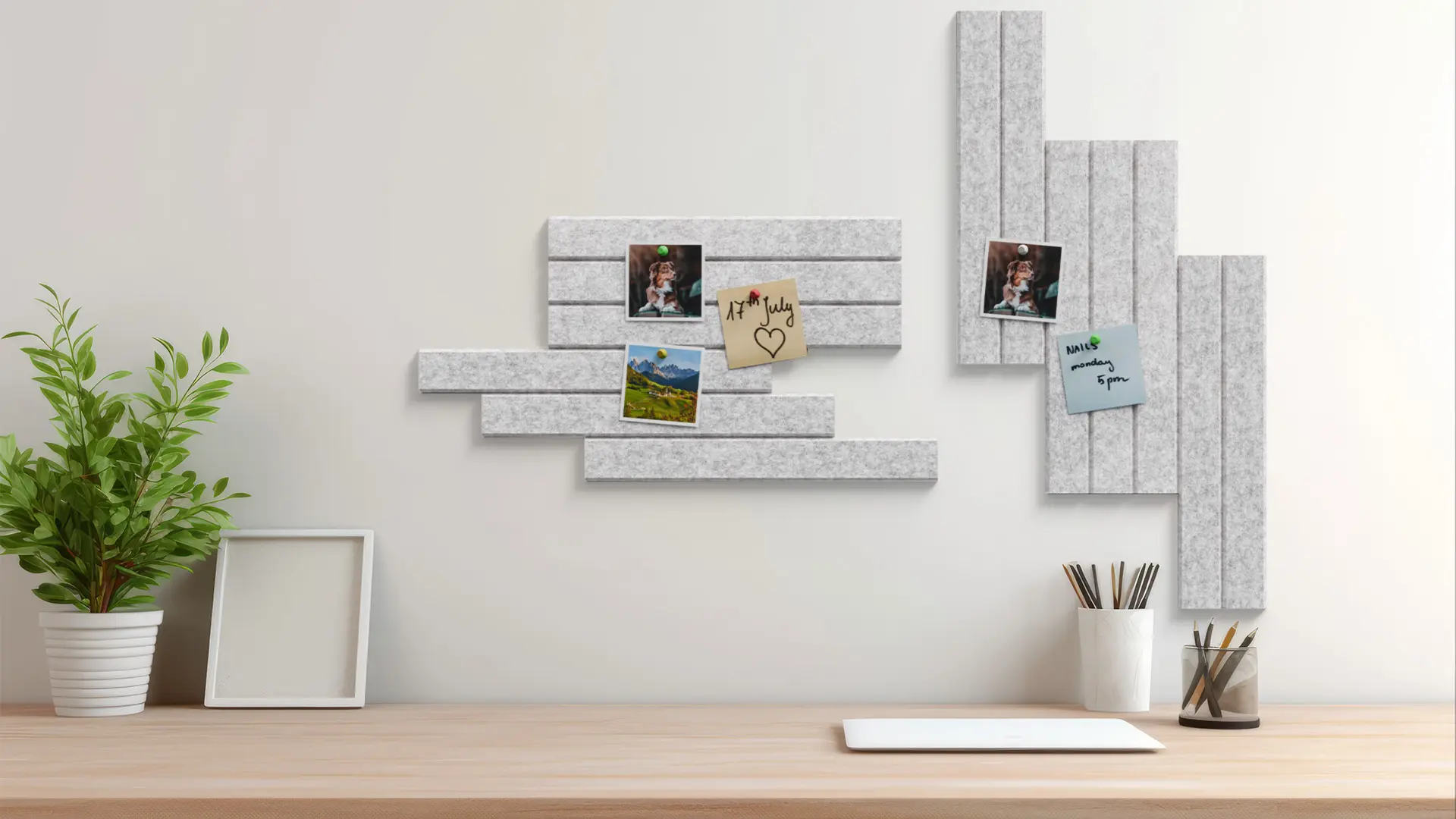 Panele ścienne filcowe to szybki sposób na zmianę aranżacji wnętrza i stworzenie funkcjonalnej przestrzeni na notatki, zdjęcia czy planery. Zamień pustą ścianę w miejsce pełne inspiracji – wystarczy odkleić zabezpieczenie i przykleić panel tam, gdzie chcesz!