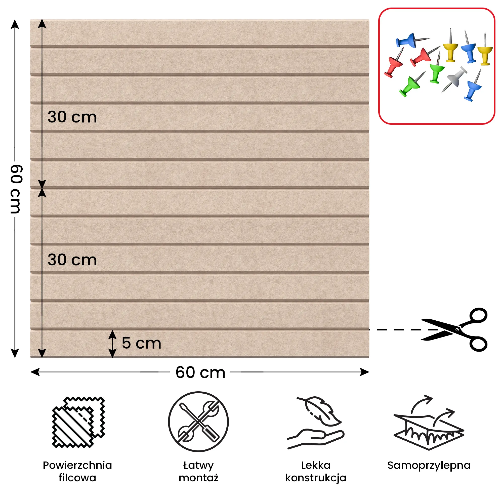 - PRAKTYCZNA PRZESTRZEŃ – filcowa powierzchnia umożliwia wygodne przypinanie notatek, zdjęć, planów czy inspiracji przy pomocy pinezek. Idealna do codziennego użytku w domu, biurze, szkole czy pokoju dziecka.
