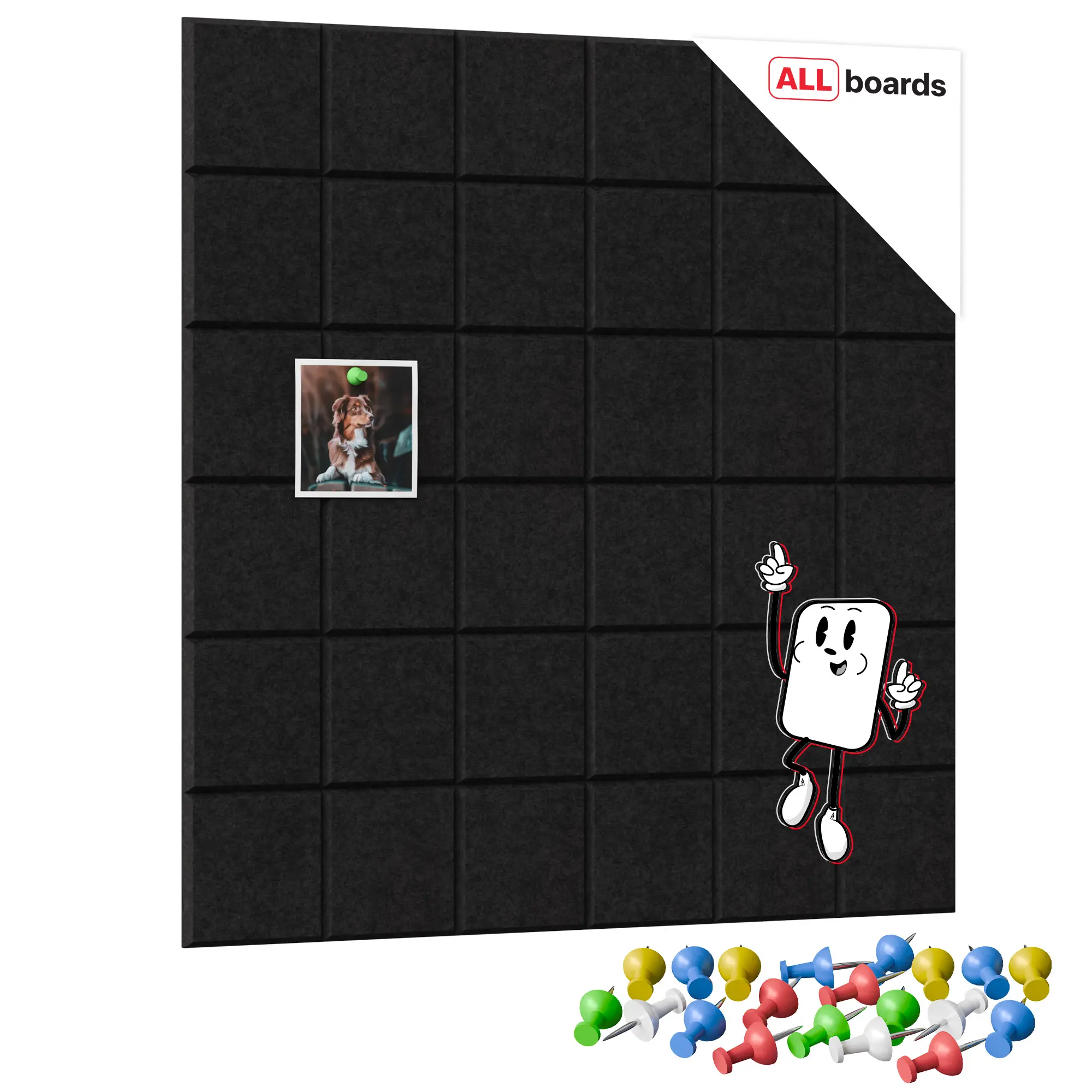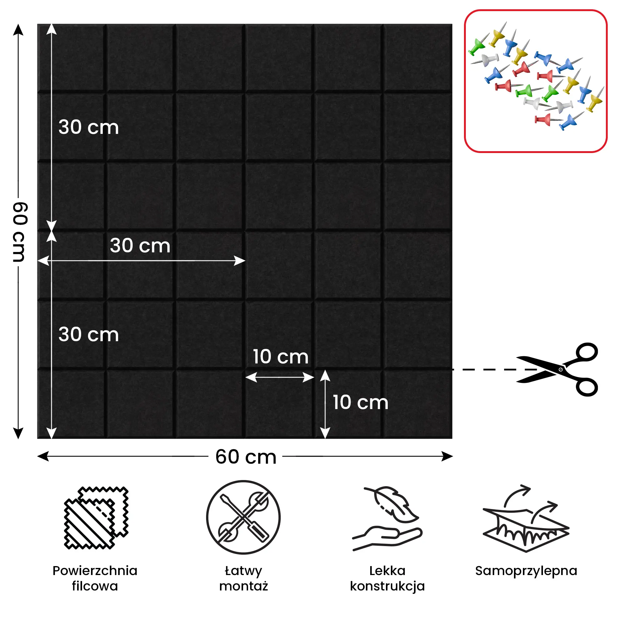 - PRAKTYCZNA PRZESTRZEŃ – filcowa powierzchnia umożliwia wygodne przypinanie notatek, zdjęć, planów czy inspiracji przy pomocy pinezek. Idealna do codziennego użytku w domu, biurze, szkole czy pokoju dziecka.