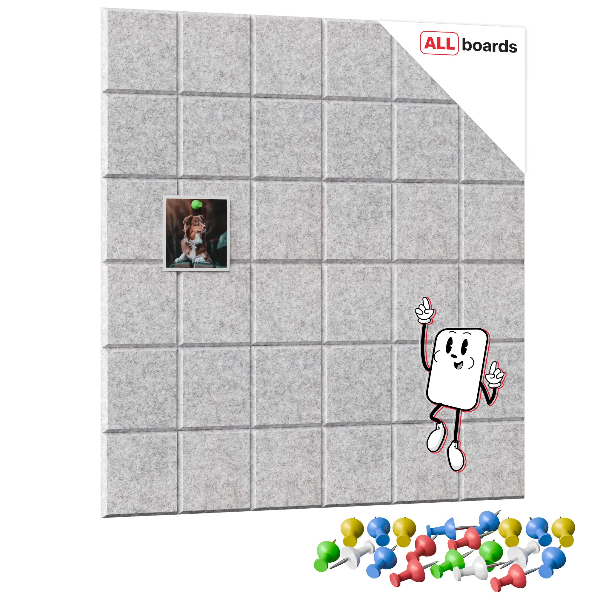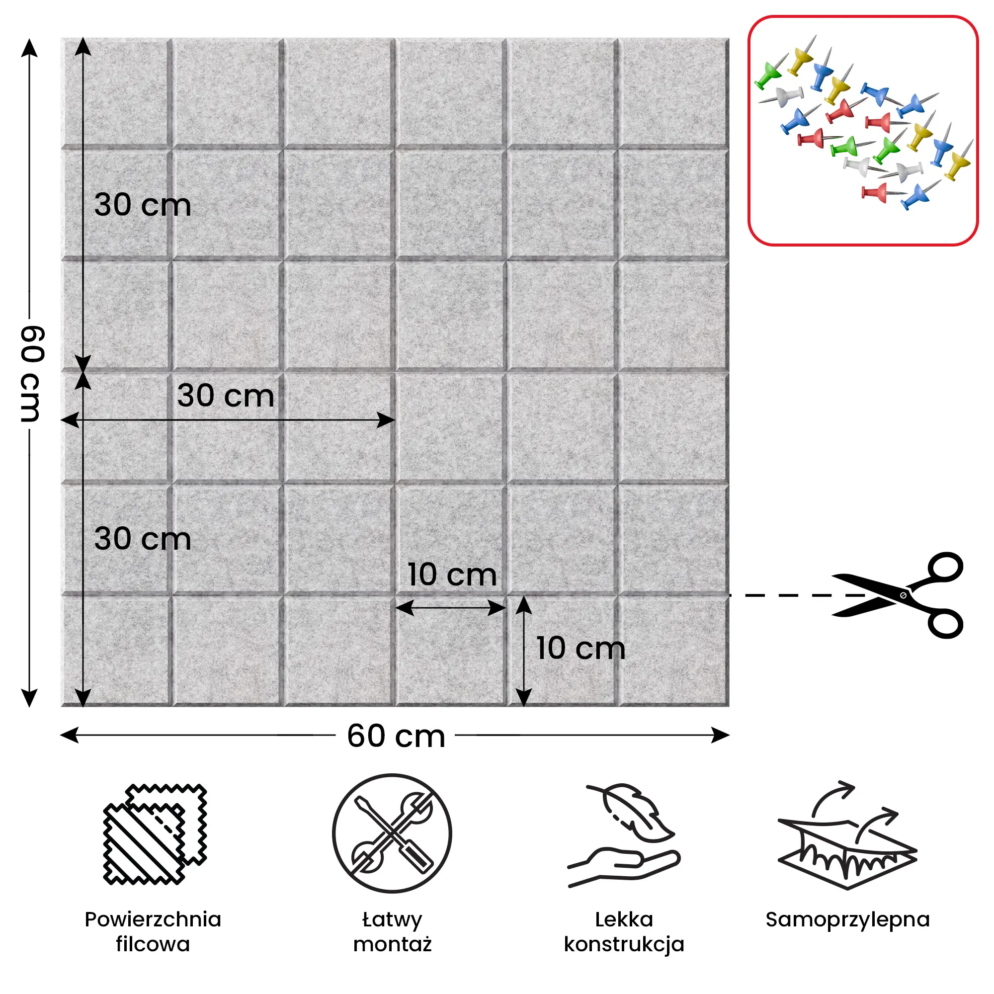 - PRAKTYCZNA PRZESTRZEŃ – filcowa powierzchnia umożliwia wygodne przypinanie notatek, zdjęć, planów czy inspiracji przy pomocy pinezek. Idealna do codziennego użytku w domu, biurze, szkole czy pokoju dziecka.
