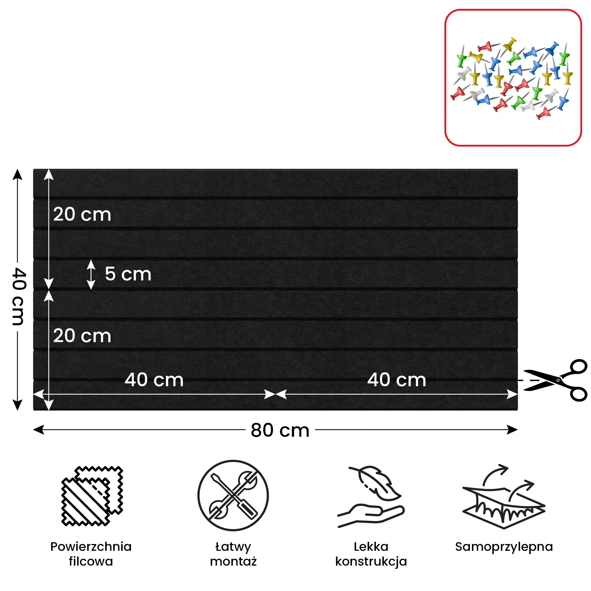 • PRAKTYCZNA PRZESTRZEŃ – filcowa powierzchnia umożliwia wygodne przypinanie notatek, zdjęć, planów czy inspiracji przy pomocy pinezek. Idealna do codziennego użytku w domu, biurze, szkole czy pokoju dziecka.