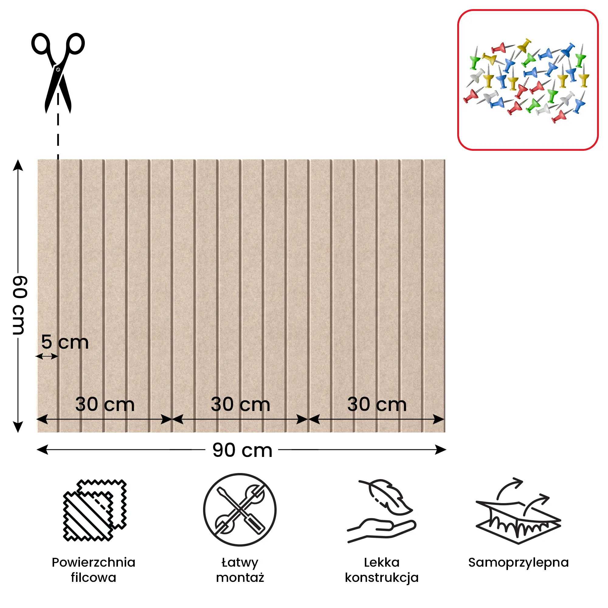 • PRAKTYCZNA PRZESTRZEŃ – filcowa powierzchnia umożliwia wygodne przypinanie notatek, zdjęć, planów czy inspiracji przy pomocy pinezek. Idealna do codziennego użytku w domu, biurze, szkole czy pokoju dziecka.