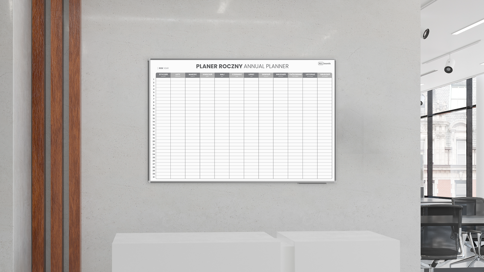 Planer roczny powstał w oparciu o tablicę magnetyczną suchościeralną w rozmiarze 120x90 cm, w ramie aluminiowej typu EXPO.