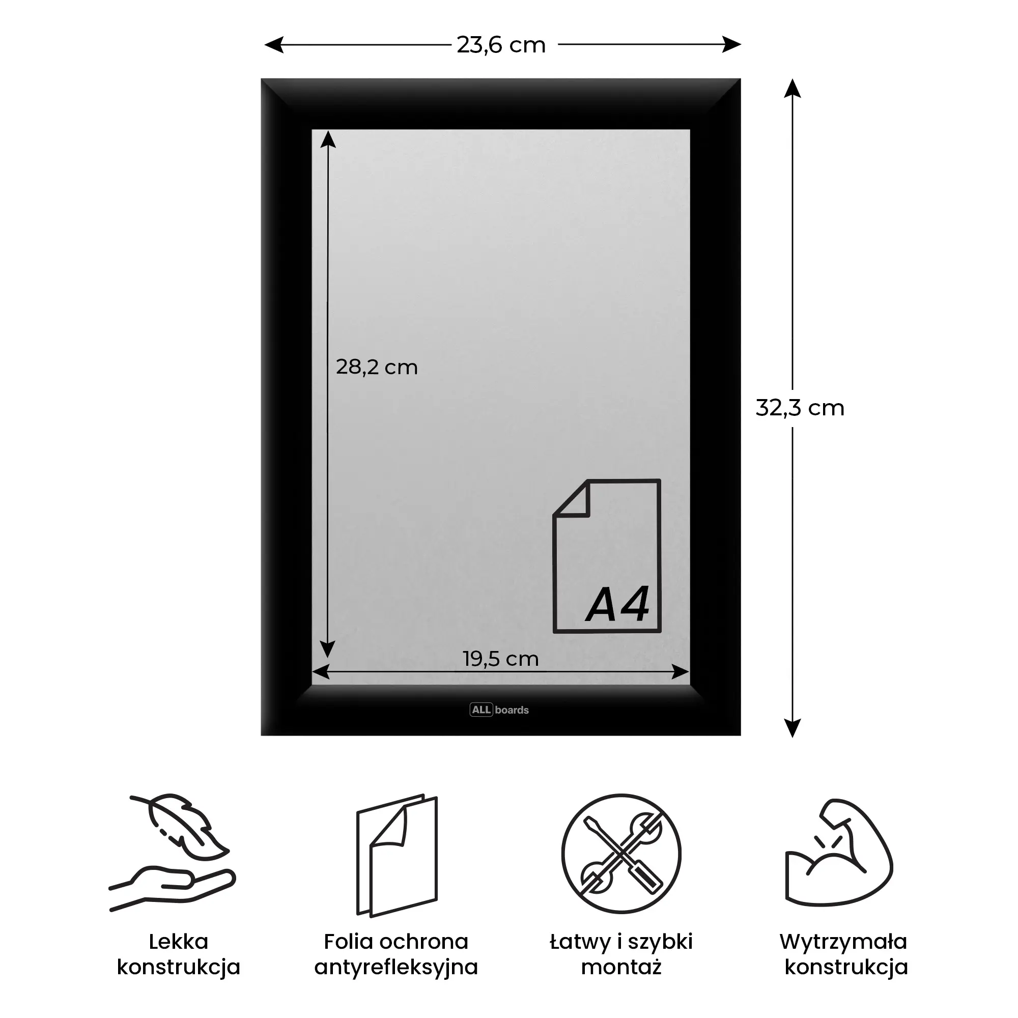 - Funkcjonalna i trwała – ramka plakatowa A4 z systemem OWZ (otwórz–włóż–zamknij) to niezawodne rozwiązanie do estetycznej prezentacji plakatów, ogłoszeń, grafik czy materiałów promocyjnych. Wykonana z anodowanego aluminium, łączy elegancki wygląd z odpornością na uszkodzenia i czynniki atmosferyczne. To idealna opcja do zastosowania zarówno wewnątrz, jak i na zewnątrz budynku.