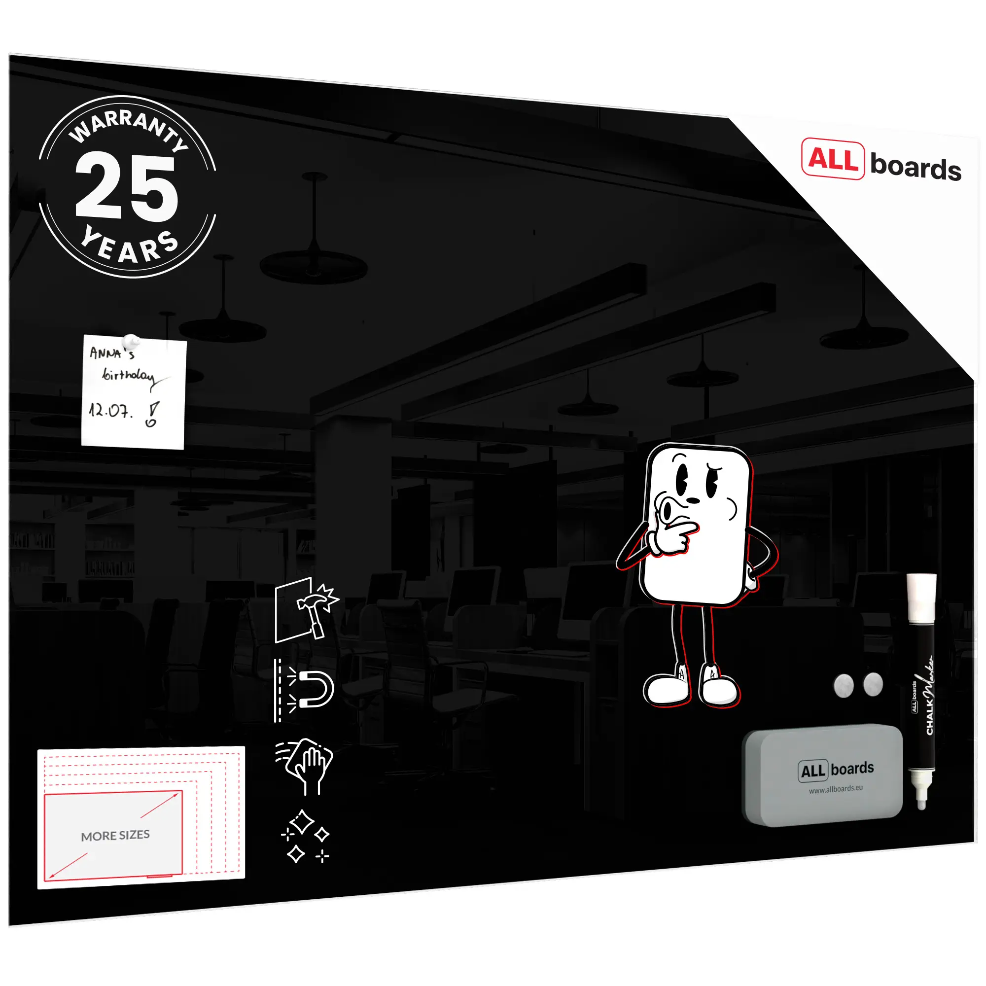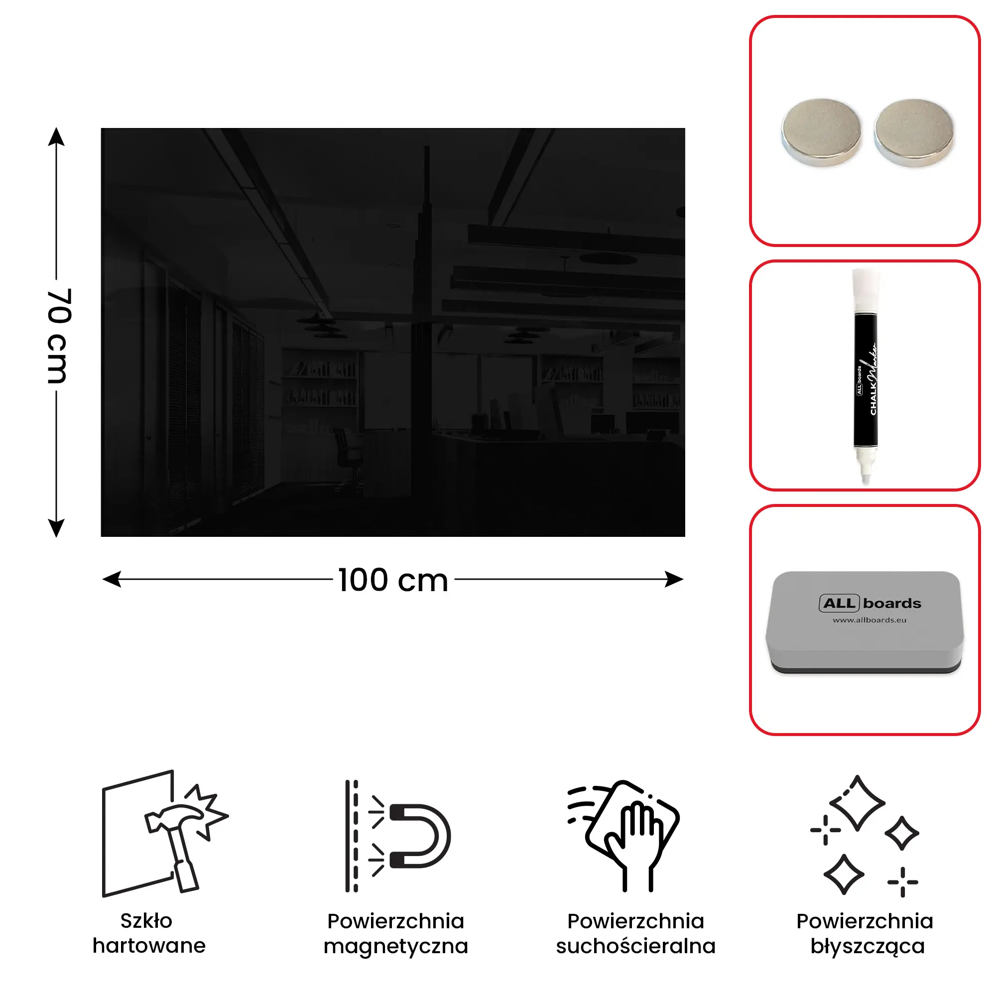 • GRATIS — w zestawie z tablicą znajdują się: marker kredowy, gąbka magnetyczna oraz 2 magnesy neodymowe.