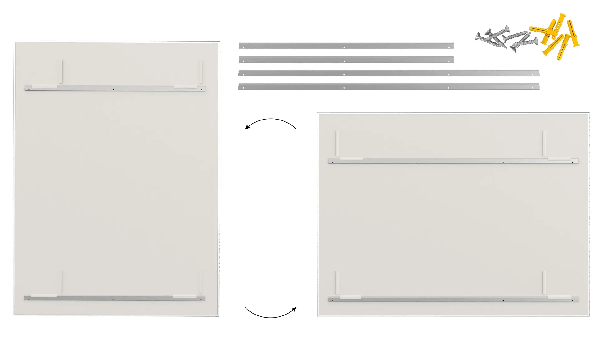 Tablica jest wyposażona w mocowania, które umożliwiają łatwe zawieszenie w pionie lub poziomie (zależnie od preferencji). Do montażu zalecamy użycie kołków rozporowych z główką o średnicy 7-8 mm. Mniejszy rozmiar główki wkręta spowoduje, że tablica spadnie, natomiast większy rozmiar główki nie zmieści się w otworze wytłoczonej zawieszki. Pamiętaj, że zamontowana tablica powinna odstawać od ściany na ok. 5 mm.