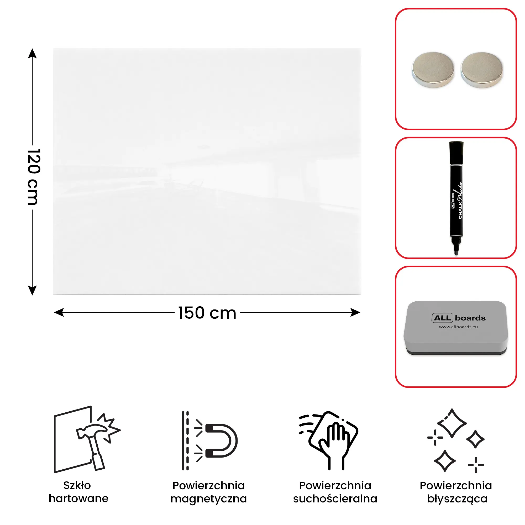 - GRATIS — w zestawie z tablicą znajdują się: marker kredowy, gąbka magnetyczna oraz 2 magnesy neodymowe.