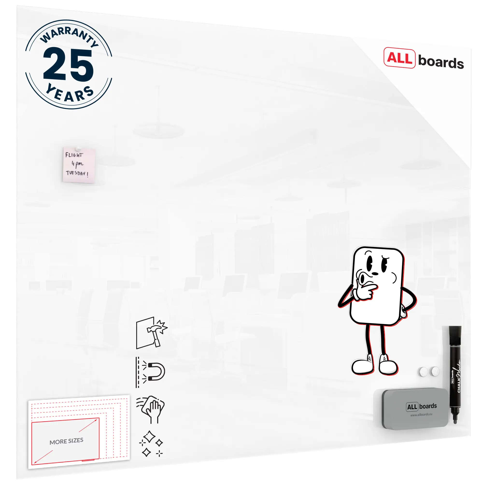 Do wykonania tablicy zostało wykorzystane szkło hartowane o grubości 4 mm. Krawędzie szkła są szlifowane, a narożniki ścięte do kąta prostego. Zapewnia to bezpieczeństwo w codziennym użytkowaniu. Dzięki szklanej powierzchni tablica jest bardzo łatwa w codziennej pielęgnacji.