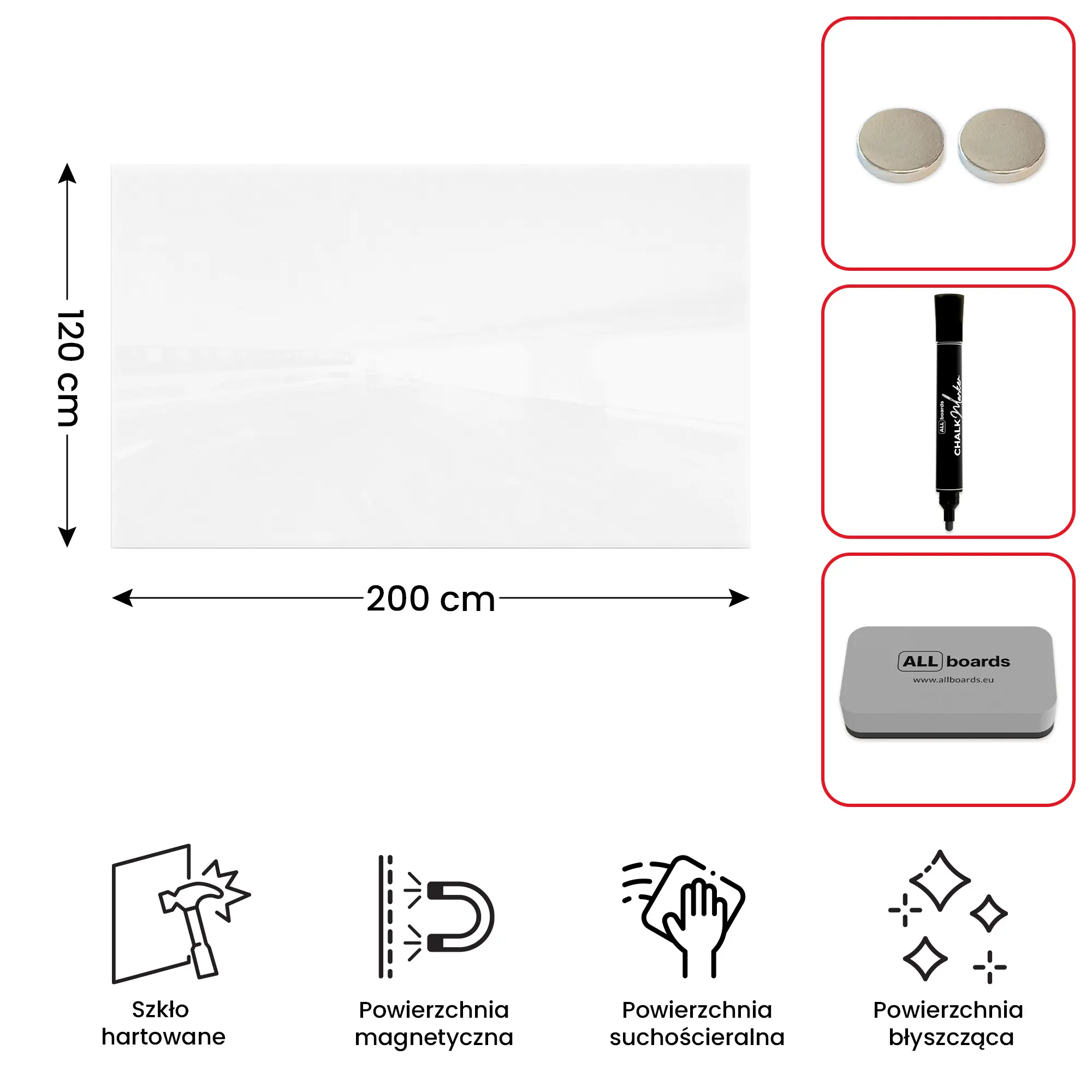 Szklana tablica magnetyczna 200x120 PREMIUM SUPERWHITE (super biała) + GRATIS