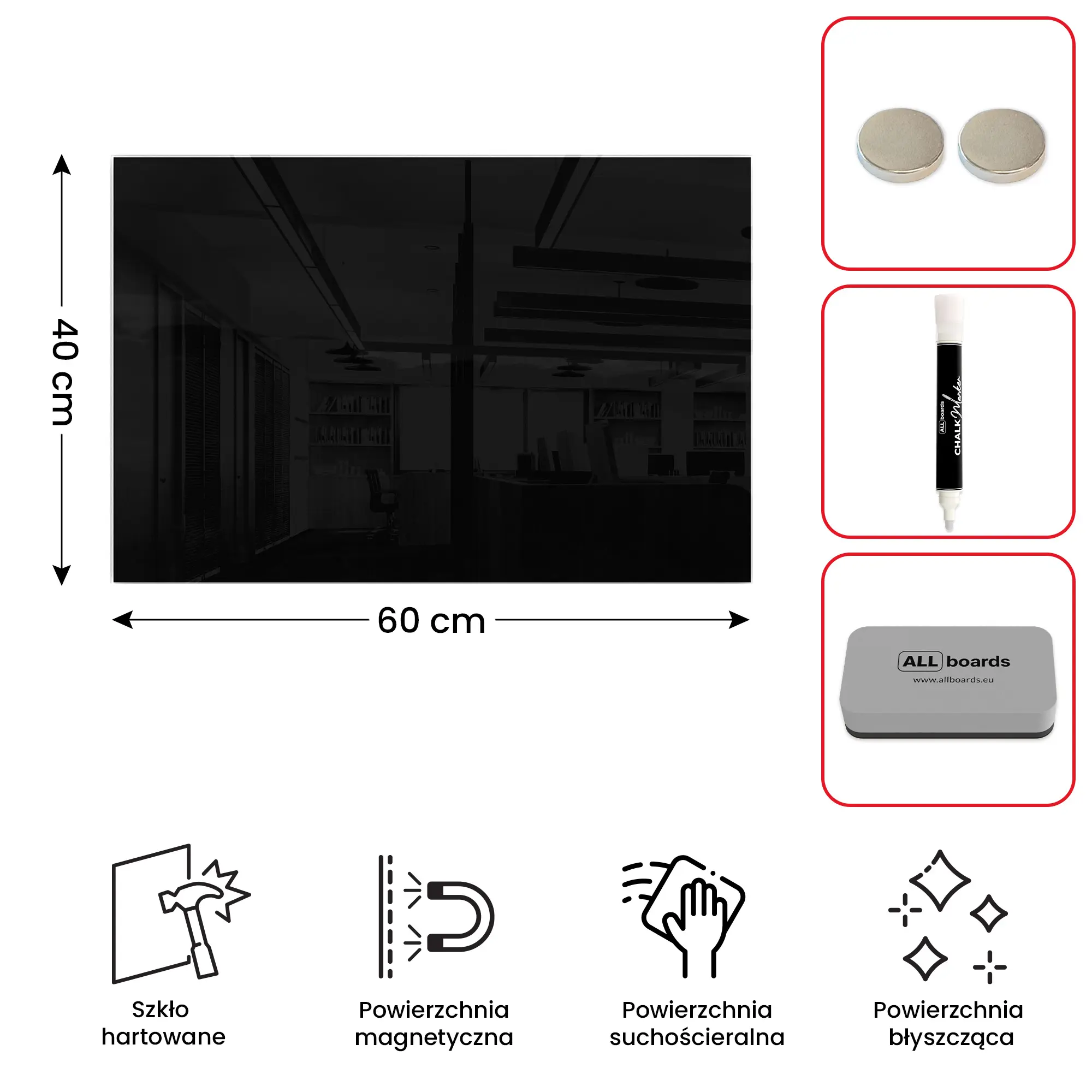 - GRATIS — w zestawie z tablicą znajdują się: marker kredowy, gąbka magnetyczna oraz 2 magnesy neodymowe.