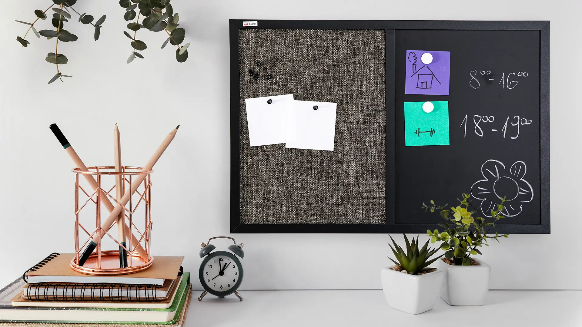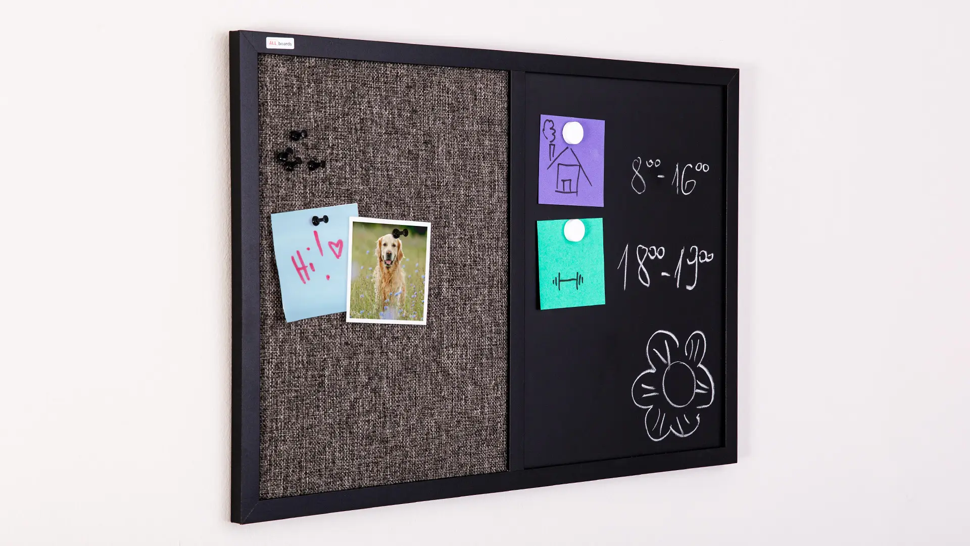 • Modna i praktyczna - kombinacyjna tablica jest nie tylko funkcjonalna, ale także elegancka. Znakomicie komponuje się z wystrojem mieszkania lub biura. Jest też świetnym pomysłem do pokoju dziecięcego.