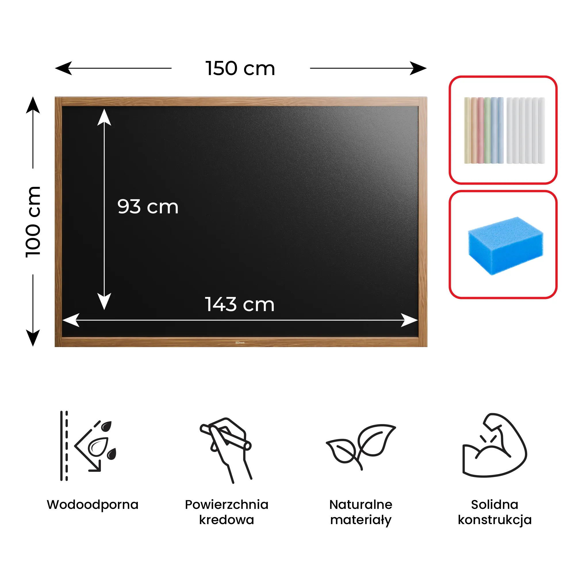 - POWIERZCHNIA - tablica wyposażona jest w czarną, kredową tablicę do pisania, wykonaną z tworzywa sztucznego ABS. Zapewnia jej to pełną odporność na wodę! Jest bardzo trwała, można po niej pisać kredą oraz markerami kredowymi.!