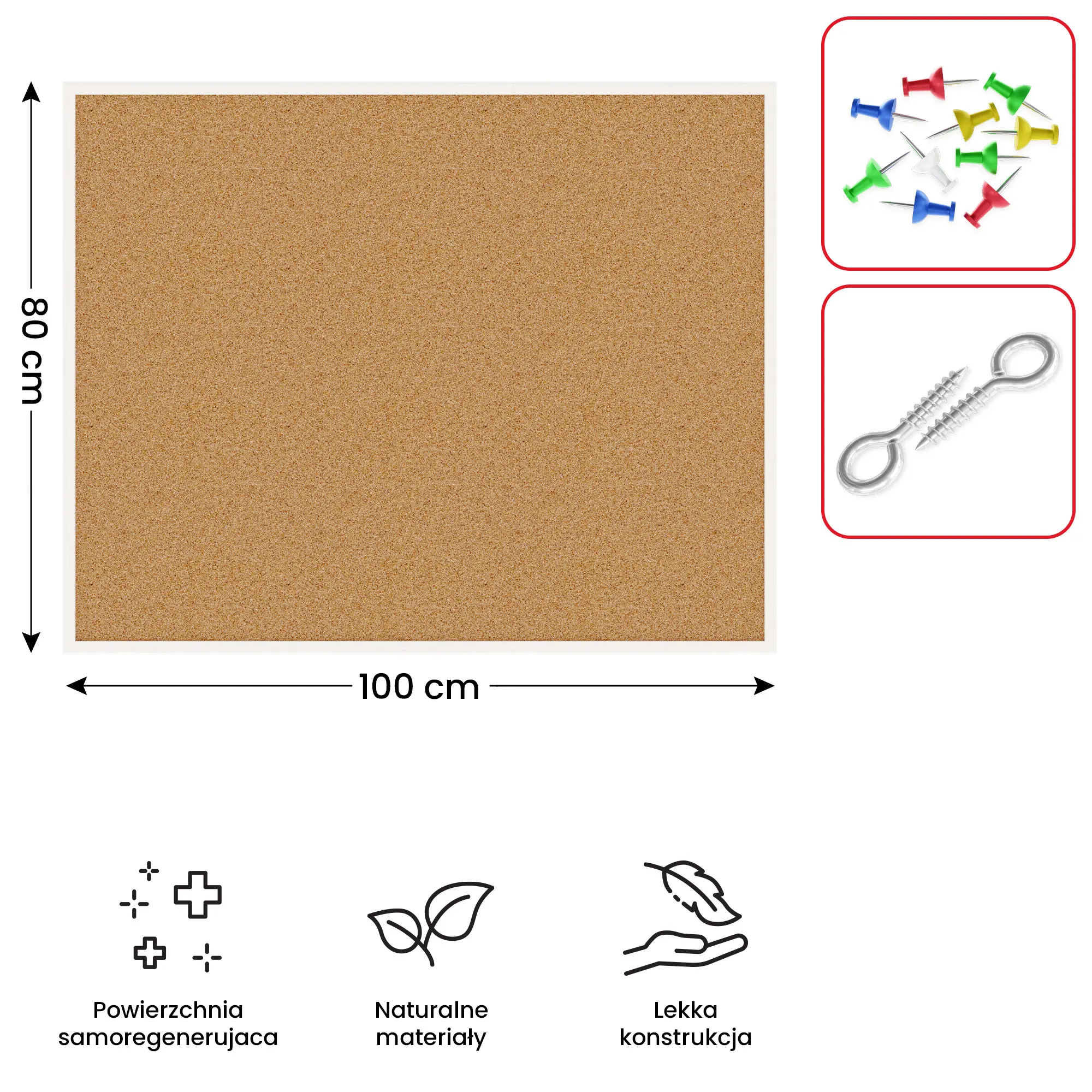 • WIELOFUNKCYJNA - tablica idealnie nadaje się do uporządkowania notatek, jako organizer, bądź do prezentacji zdjęć. Materiały przypinamy do niej za pomocą pinezek lub igieł.