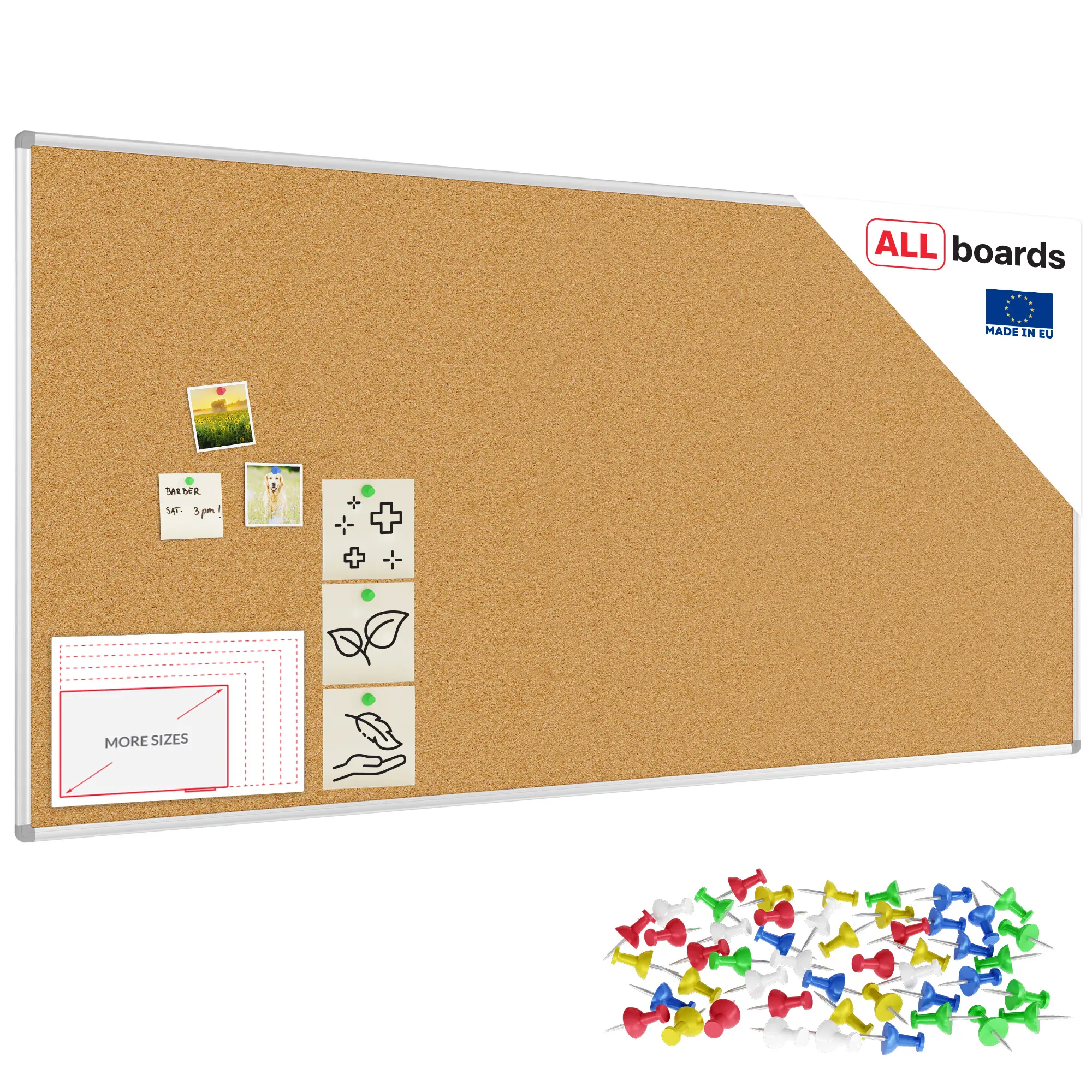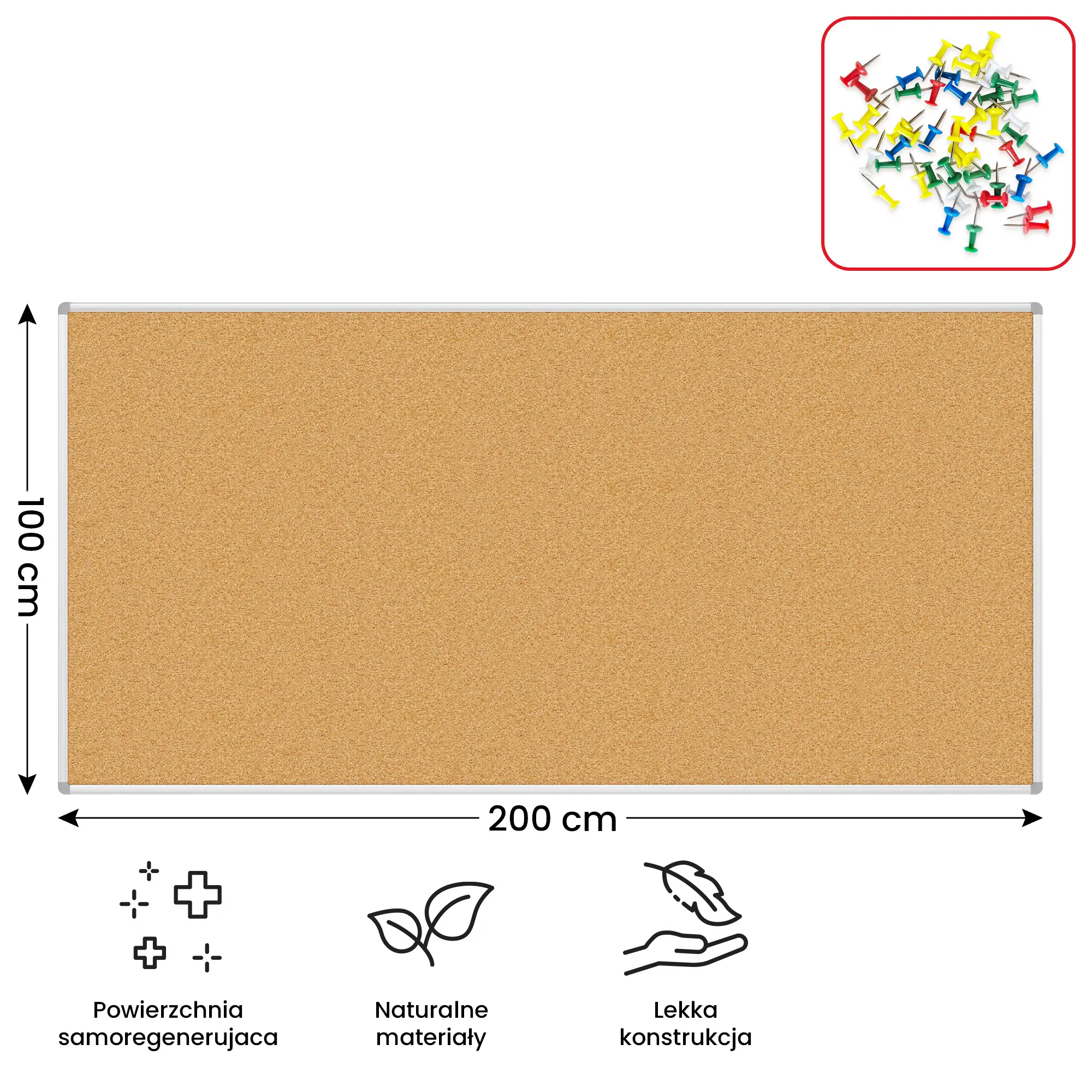 W zestawie znajduje się 50 kolorowych pinezek, co pozwala korzystać z tablicy od razu po wyjęciu z opakowania!