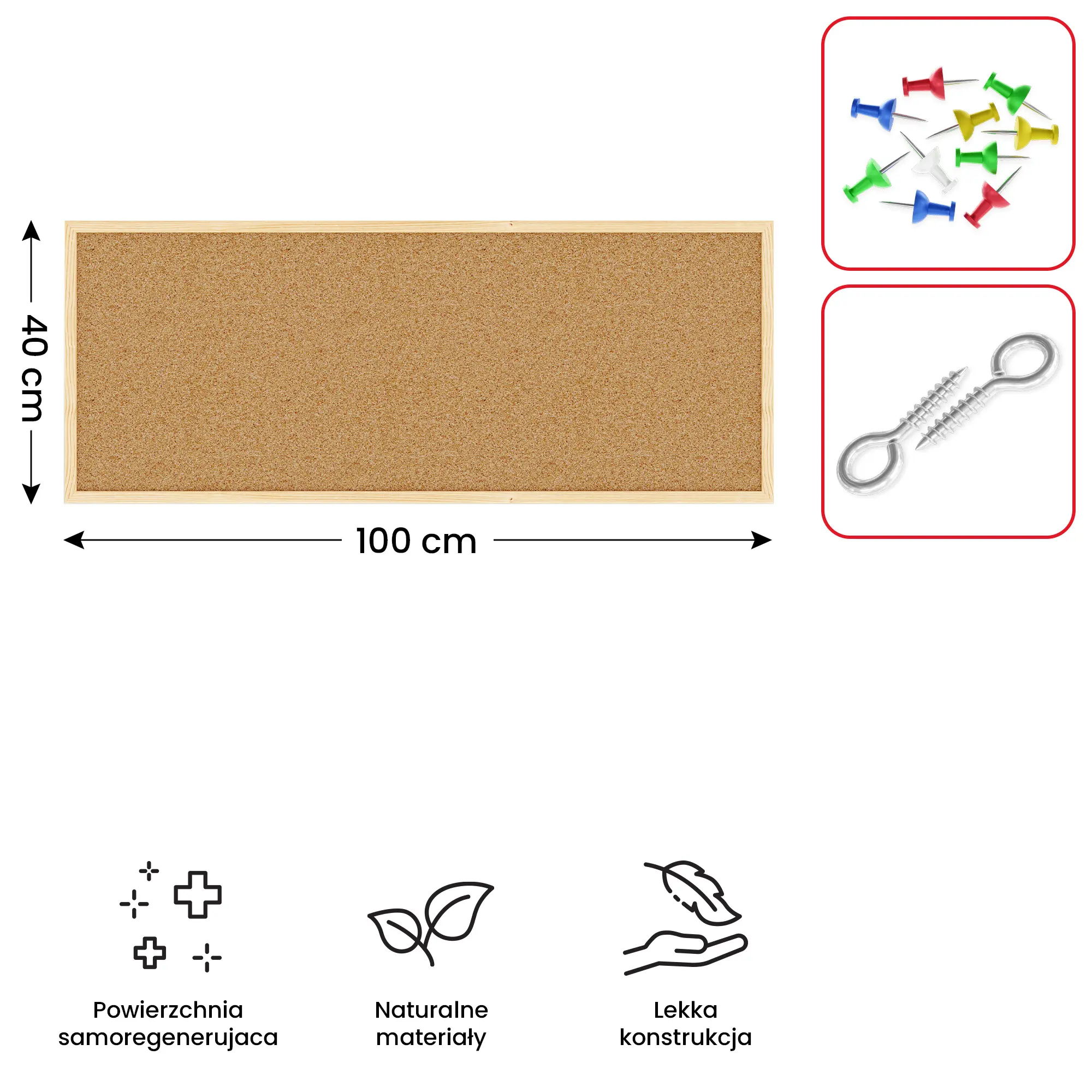 Tablica korkowa w rozmiarze 100x40 cm ma właściwości samoregenerujące. Oznacza to, że po krótkim czasie po wyciągnięciu igły lub pinezki, korek samoczynnie się kurczy. Zapewnia to długoletnią wytrzymałość i możliwość intensywnego używania tablicy.