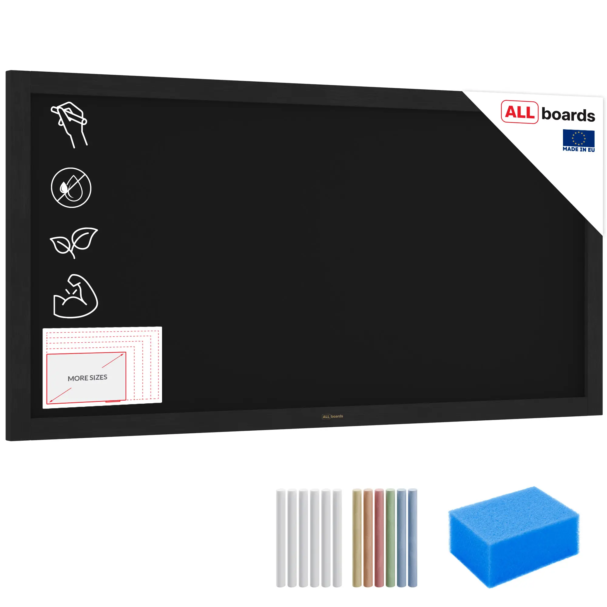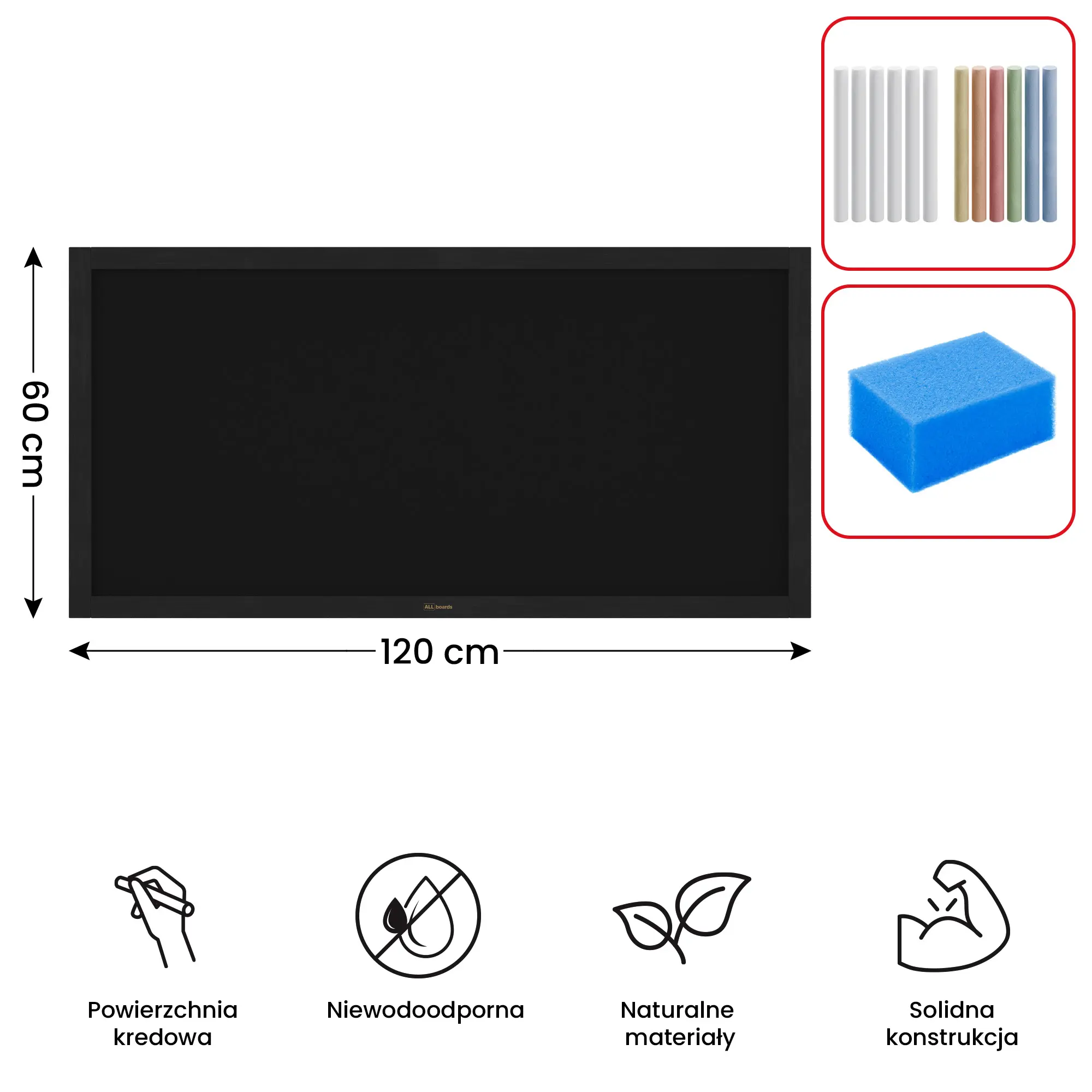 - GRATIS - w zestawie znajduje się 12 sztuk kredy i gąbka do tablic kredowych, dzięki czemu tablicy można użyć od razu po wyjęciu z opakowania.