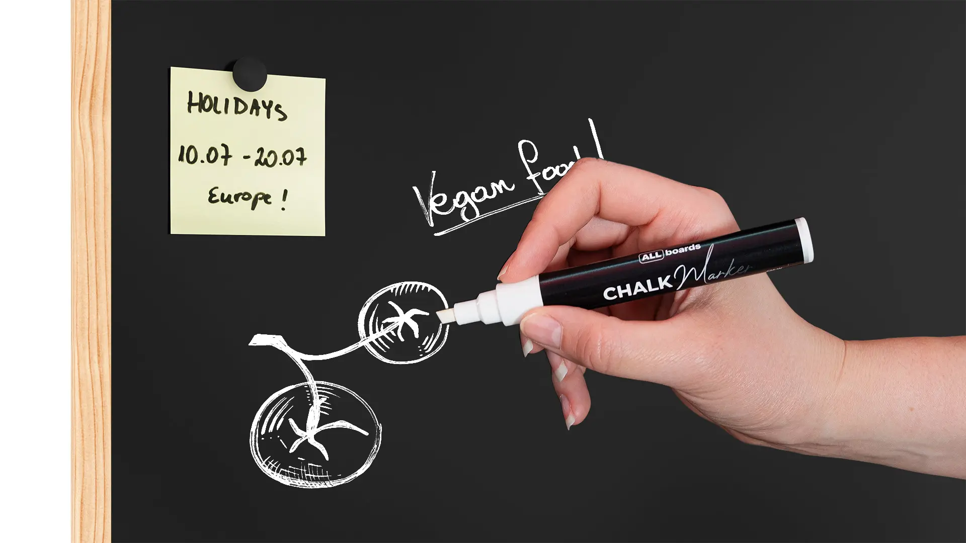 Tablica magnetyczna kredowa ALLboards to tablica wykonana z czarnej kredowej blachy. Posiada wiele zalet. Po pierwsze, można pisać po niej markerami kredowymi oraz kredą. Tablice czyścimy za pomocą wilgotnej szmatki lub gąbki. Po drugie, tablica posiada magnetyczną powierzchnię. Dzięki temu przypniemy do niej magnesy (zarówno klasyczne jak i neodymowe) jak i inne magnetyczne rzeczy.