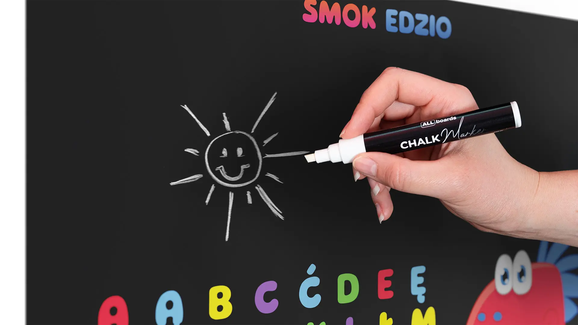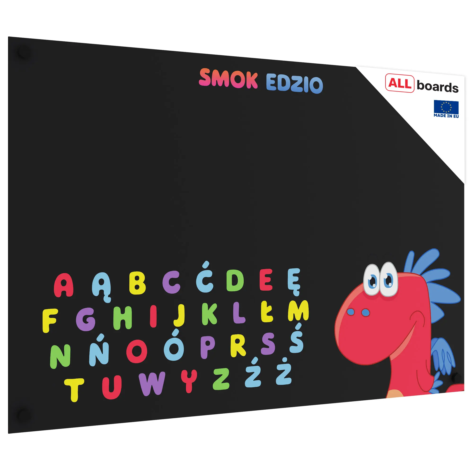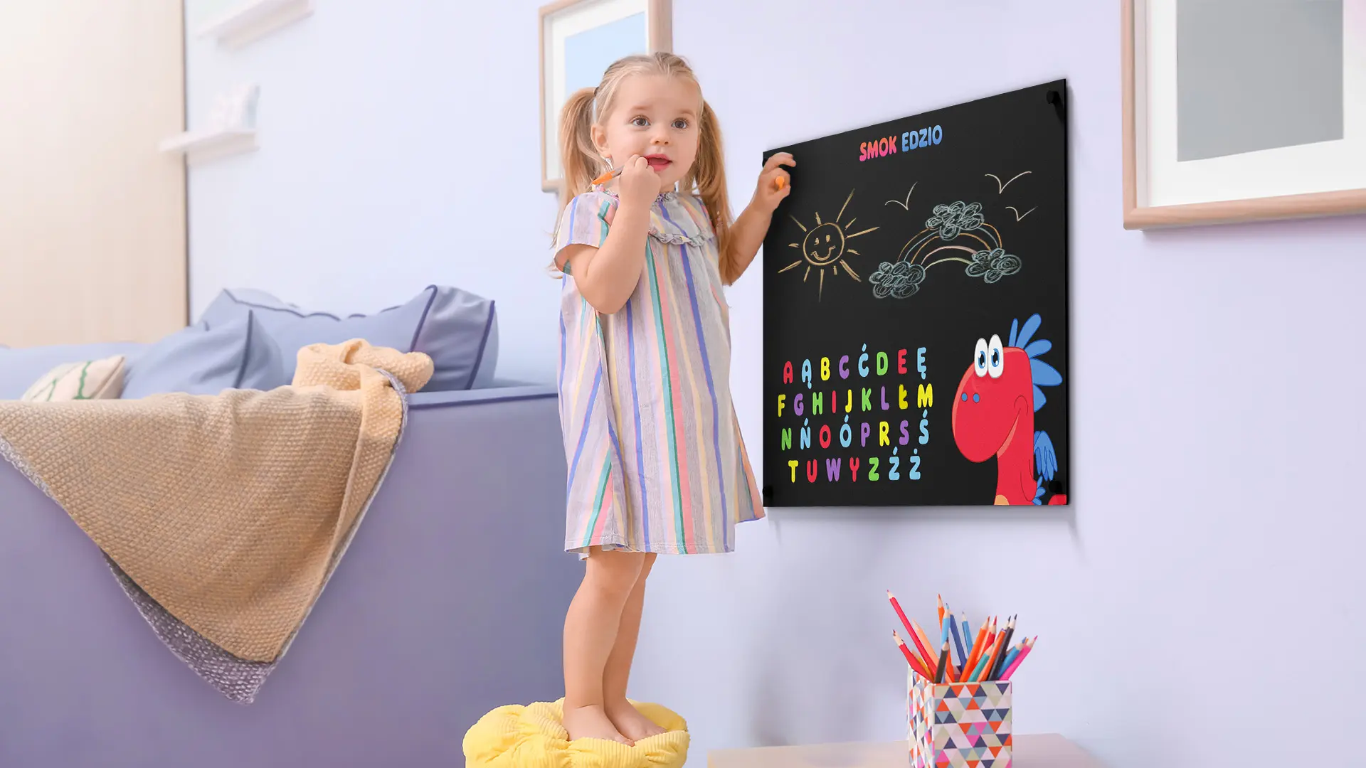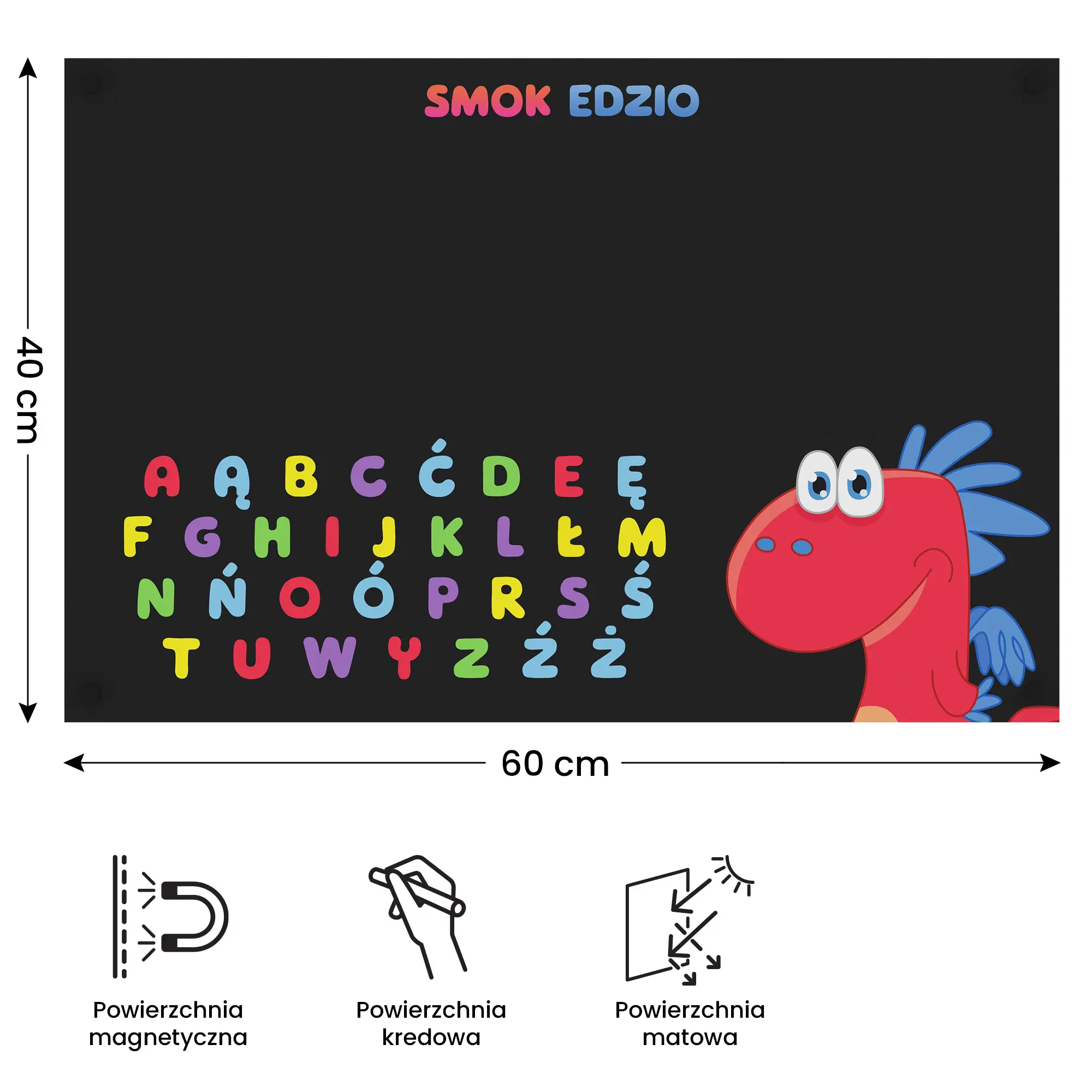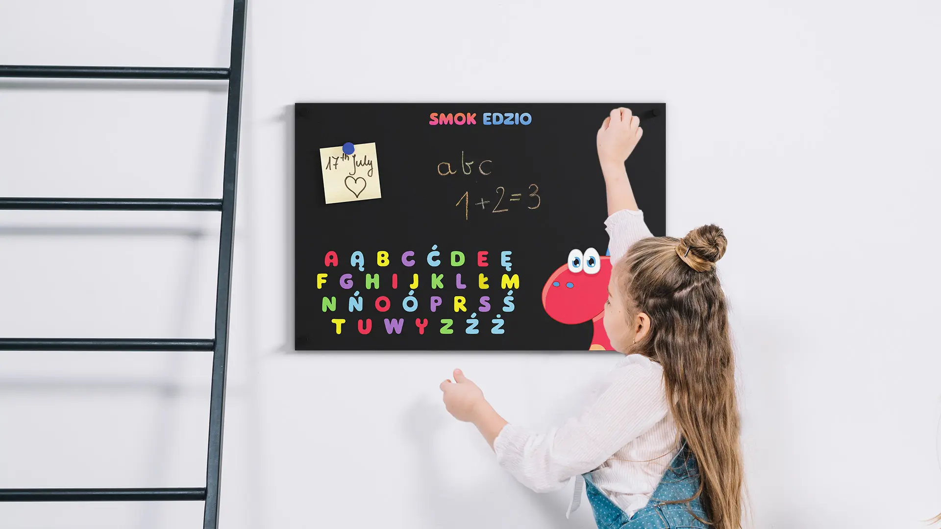 - SZAROKIE ZASTOSOWANIE – czarna tablica to wszechstronne narzędzie wspierające naukę i kreatywną zabawę. W pokoju dziecięcym sprawdzi się do nauki literek, rysowania i planowania codziennych zadań. Dzięki nadrukowi alfabetu i postaci Smoka Edzia każde ćwiczenie stanie się przyjemną przygodą, a dziecko łatwiej rozwija wyobraźnię, koncentrację i kreatywność. Tablica idealnie nadaje się także do domowego kącika nauki i zabawy, wspierając codzienne odkrycia i samodzielne zadania edukacyjne.