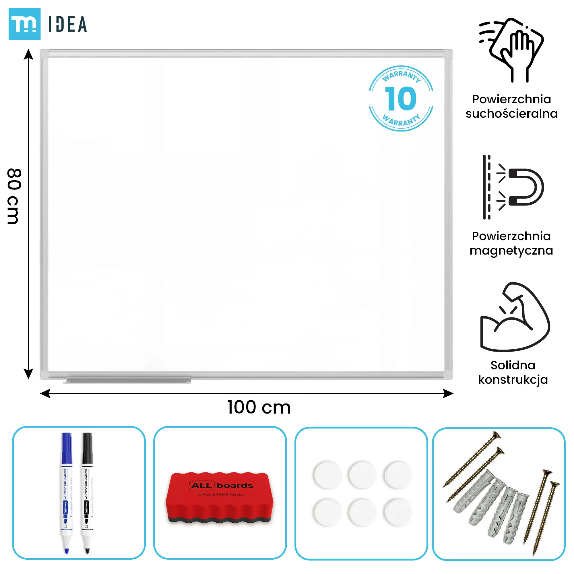 - Akcesoria gratis — wraz z tablicą w zestawie znajdziemy kompletne wyposażenie pozwalające na natychmiastowe użytkowanie: zestaw montażowy, półkę na akcesoria, gąbkę magnetyczną, 6 białych magnesów oraz 2 markery suchościeralne.