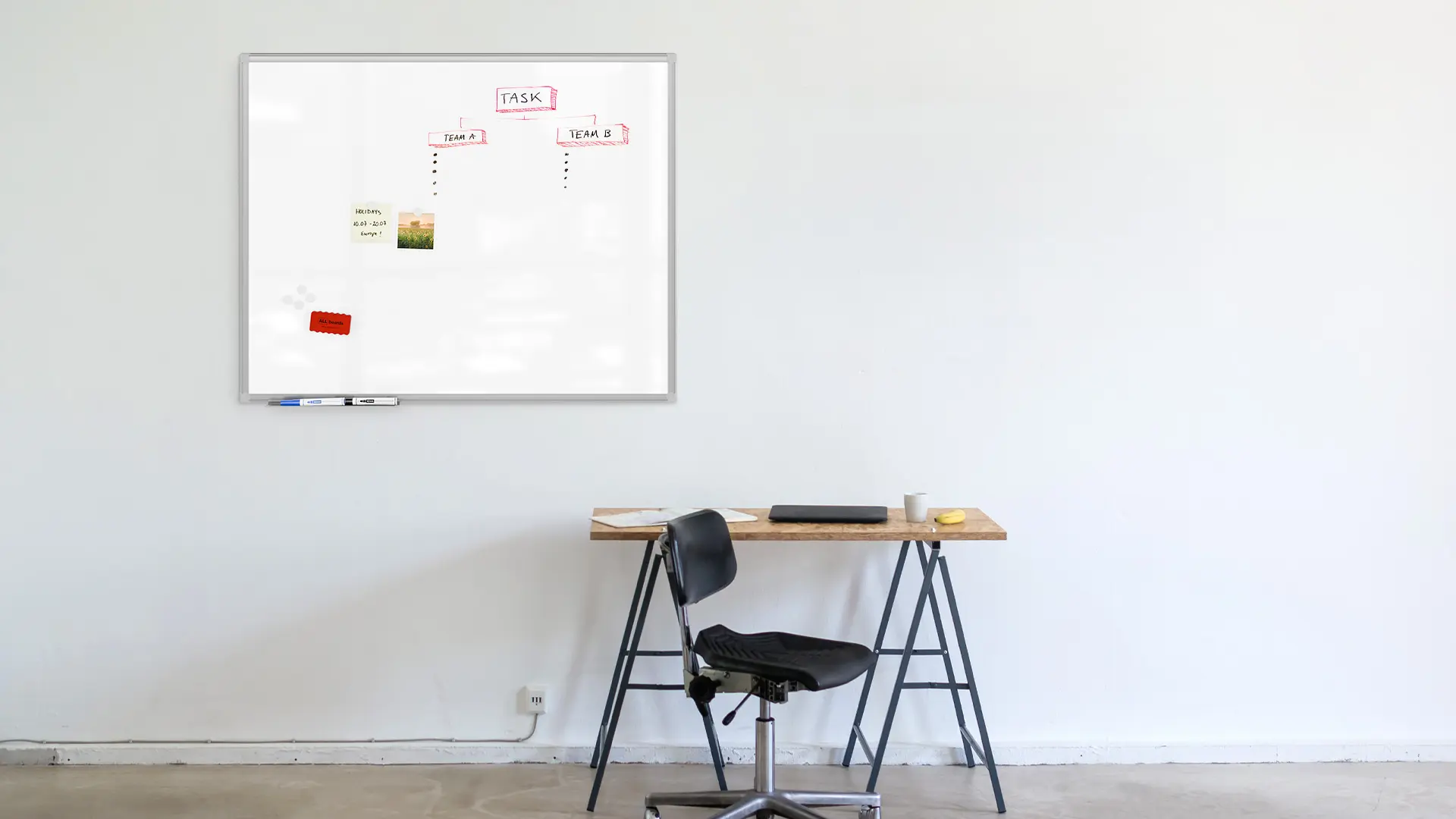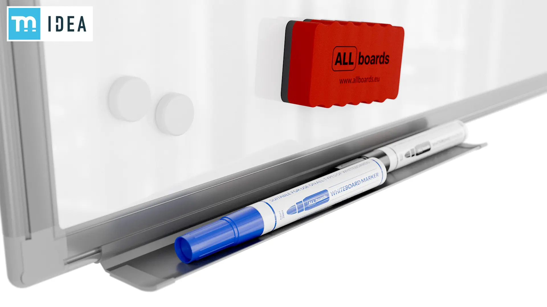 Tablica ALLboards jest wysyłana z kompletnym wyposażeniem, tak aby można było od razu przejść do działania! Do produktu dołączamy zestaw montażowy, półkę na akcesoria (która może zostać zdemontowana bez trudu w dowolnym momencie), gąbkę magnetyczną do łatwego zmywania pisaków, dwa markery suchościeralne oraz 6 białych magnesów.