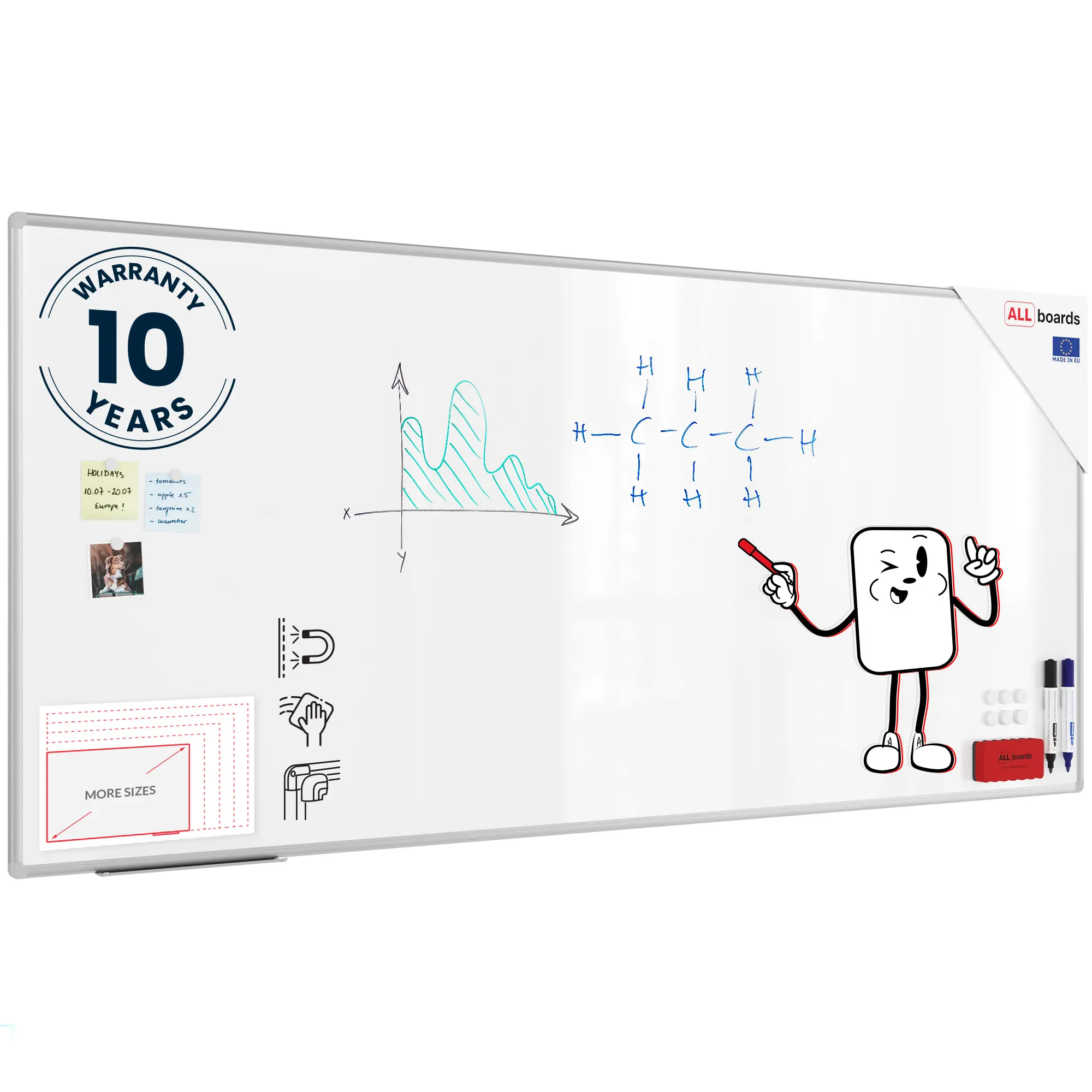 Biała magnetyczna tablica ALLboards wykonana jest z sztywnej i wytrzymałej blachy, dzięki której tablica zyskuje właściwości magnetyczne. Blacha pokryta jest warstwą lakieru, który nadaje tablicy biały kolor oraz gładką i lśniącą powierzchnię. Dzięki zastosowaniu odpowiedniego lakieru, tablice można ścierać na sucho za pomocą dołączonej do zestawu gąbki lub papierowego ręcznika. Do tablicy możemy przypinać każdego rodzaju magnesy: neodymowe, turystyczne, klasyczne, ozdobne. Znakomicie nadaje się również do wykorzystania z ramkami magnetycznymi oraz innymi magnetycznymi akcesoriami.