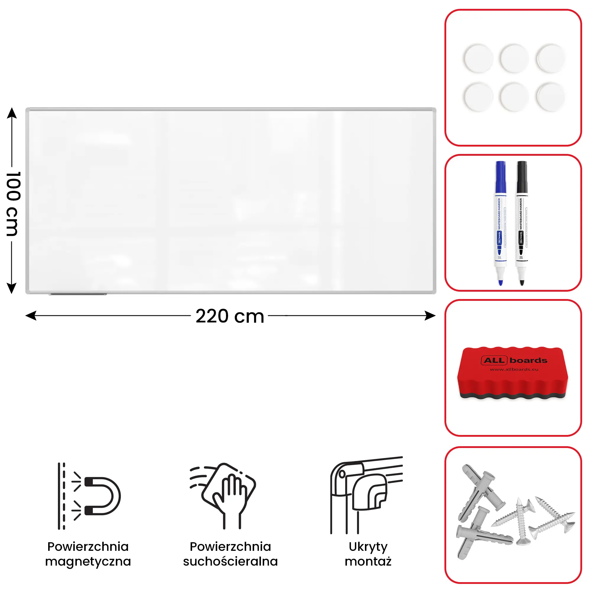 Tablica ALLboards jest znakomicie wyposażona, tak byś natychmiast mógł przejść do działania! W zestawie z tablicą znajdziesz zestaw montażowy, półkę na akcesoria (która bez problemu może zostać zdemontowana w dowolnym momencie), gąbkę magnetyczną + 6 białych magnesów oraz 2 markery suchościeralne.