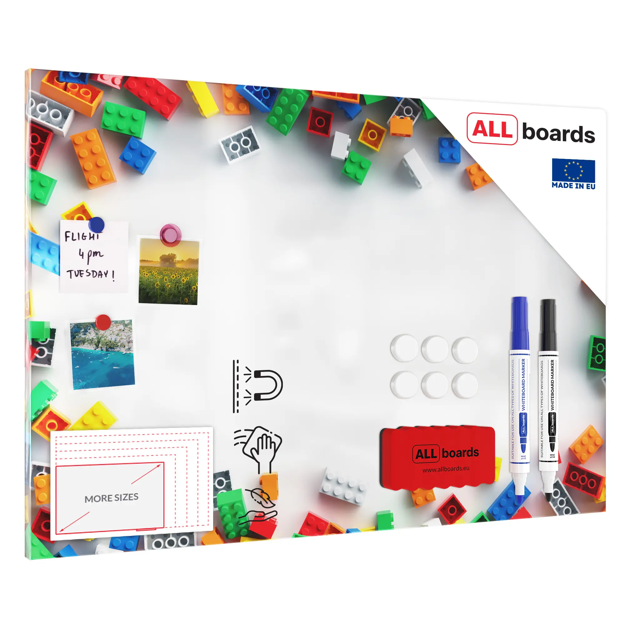 W zestawie z tablicą znajduje się: gąbka magnetyczna + 6 białych magnesów oraz 2 markery suchościeralne.