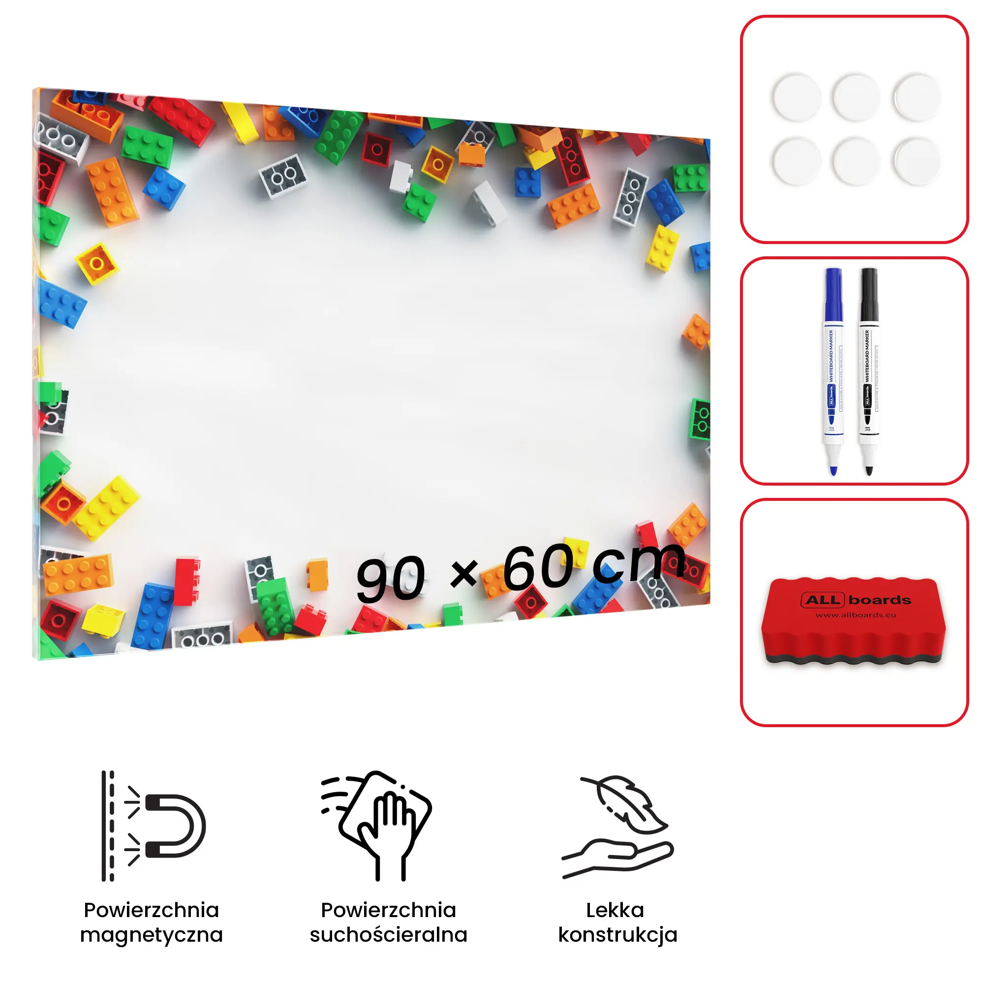 Tablica magnetyczna na magnesy METALboards, klocki 90x60 cm + zestaw akcesoriów GRATIS