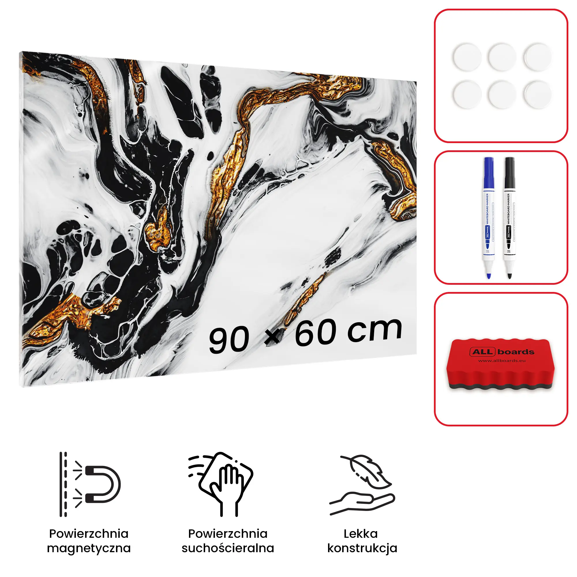 Tablica magnetyczna metalowa MARMUR ZŁOTY BIAŁY MetalBoards blacha z nadrukiem na wszystkie rodzaje magnesów + zestaw akcesoriów GRATIS