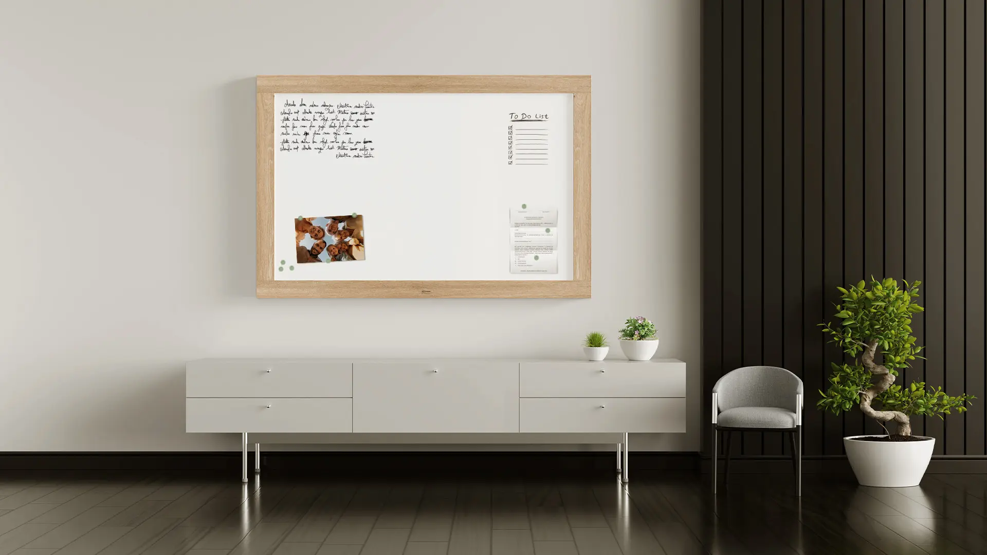 - ESTETYCZNY, WYGODNY MONTAŻ – możesz zawiesić ją na ścianie pionowo lub poziomo, dopasowując ustawienie do potrzeb. Elementy montażowe pozostają niewidoczne, a tablica wygląda świetnie w każdej aranżacji.