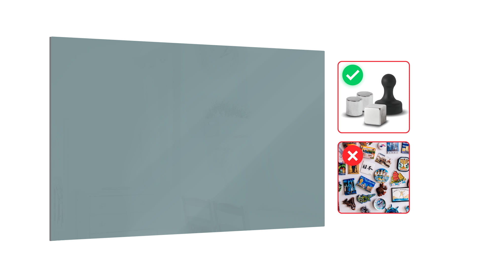 Uwaga! Do szklanych tablic magnetycznych należy stosować wyłącznie dedykowane magnesy neodymowe posiadające odpowiednią moc magnetyczną. Starsze magnesy (czarne) oraz małe (małej mocy) magnesy neodymowe nie utrzymują się na szklanej tablicy magnetycznej. Magnesy ozdobne, turystyczne (pamiątkowe) również nie utrzymują się na szklanej tablicy magnetycznej. Stosowanie zbyt mocnych magnesów neodymowych (dużych) może spowodować uszkodzenie tablicy. Należy zachować ostrożność podczas użytkowania magnesów neodymowych - niekontrolowane, bezpośrednie połączenie magnesów neodymowych może spowodować uszkodzenie skóry. Magnesy neodymowe, ze względu na swoje właściwości fizyczne, są kruche i mogą ulec pęknięciu podczas upadku lub niekontrolowanego połączenia magnesów ze sobą.