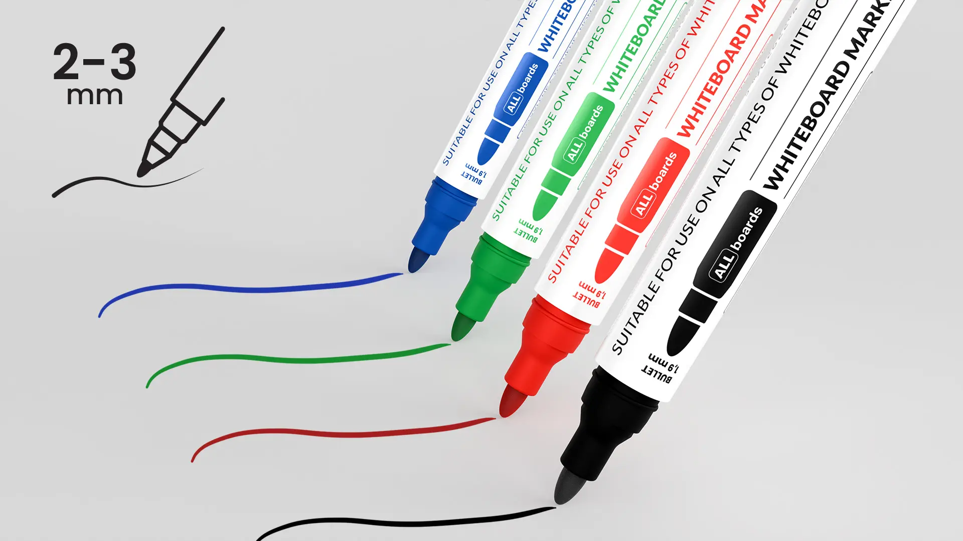 Zestaw składający się z gąbki magnetycznej i czterech markerów suchościeralnych (zielony, niebieski, czerwony, czarny).