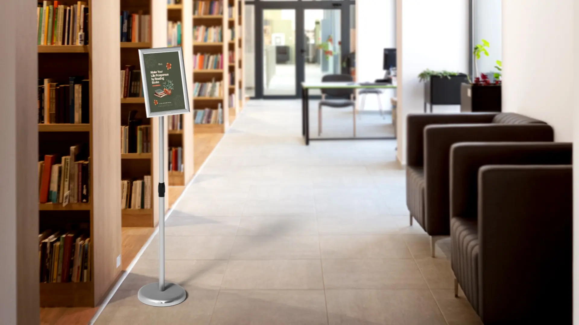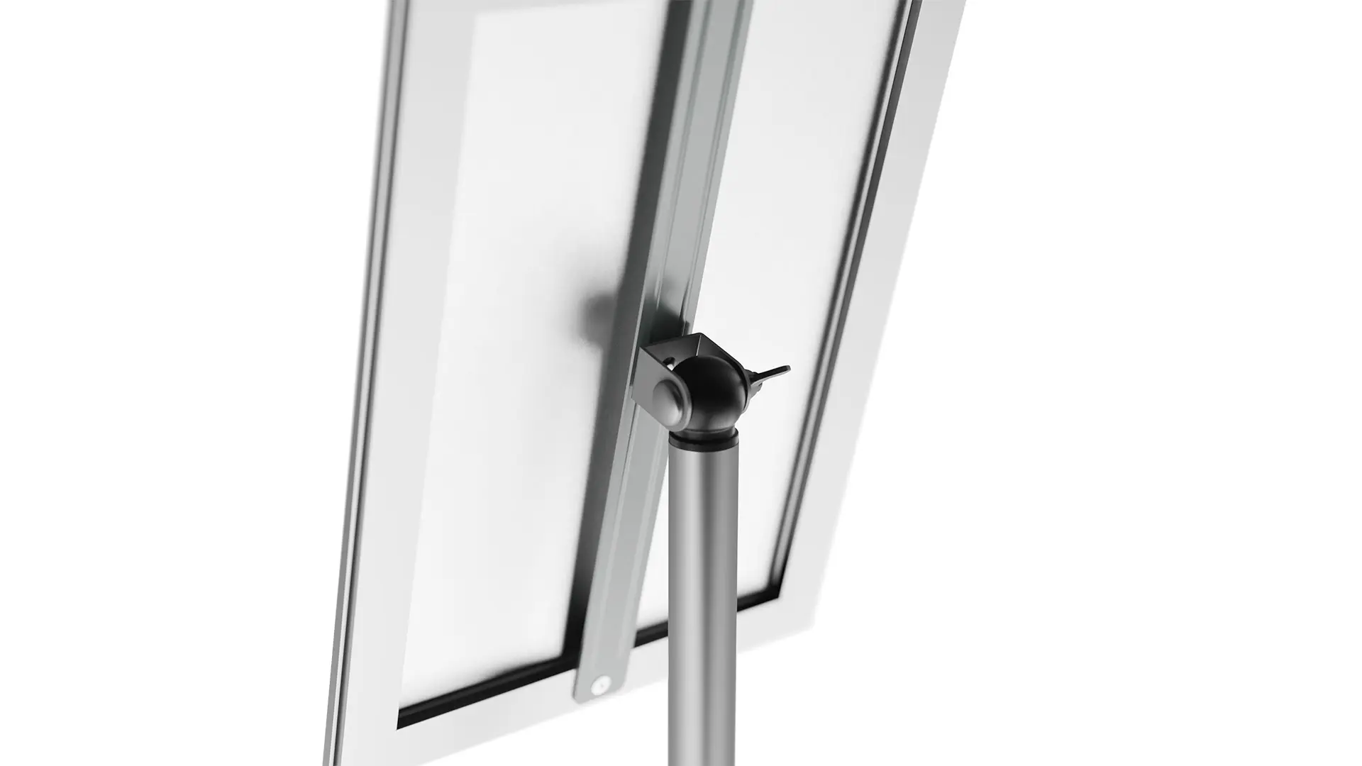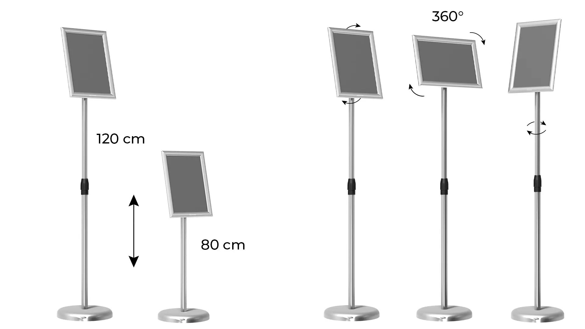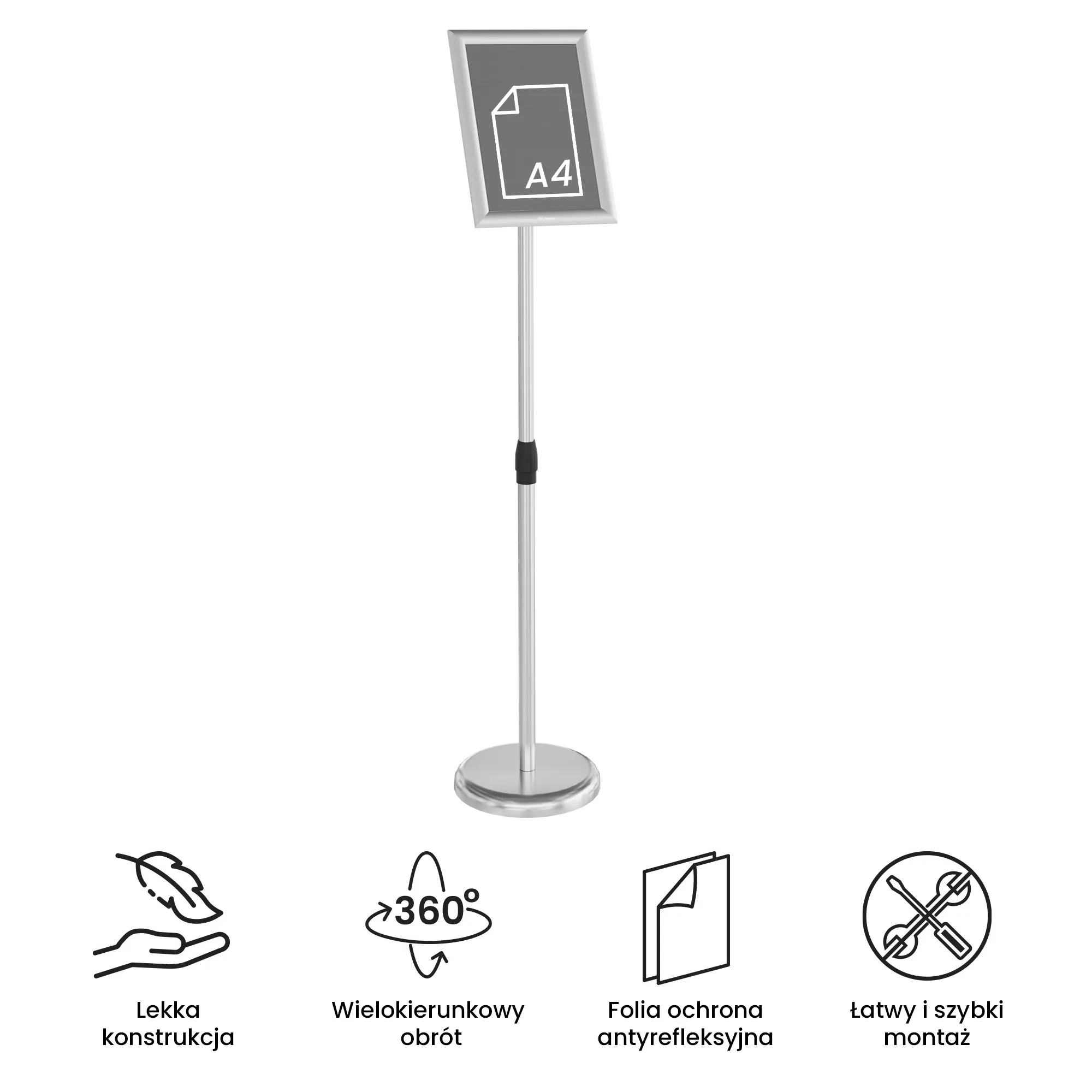 - Lekki i wytrzymały – dzięki kompaktowym wymiarom stojak można ustawić w dowolnym miejscu i łatwo przenosić go między pomieszczeniami. Rama została umieszczona na aluminiowej nodze o wysokości ok. 1 m — to optymalne rozwiązanie, dzięki któremu klient ma zapewniony łatwy dostęp do wszystkich informacji.
